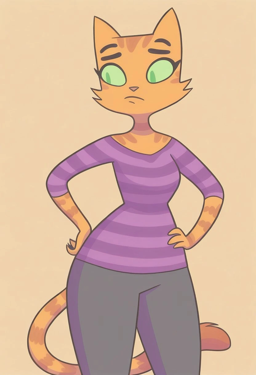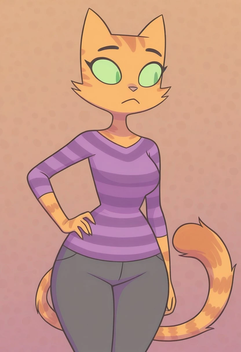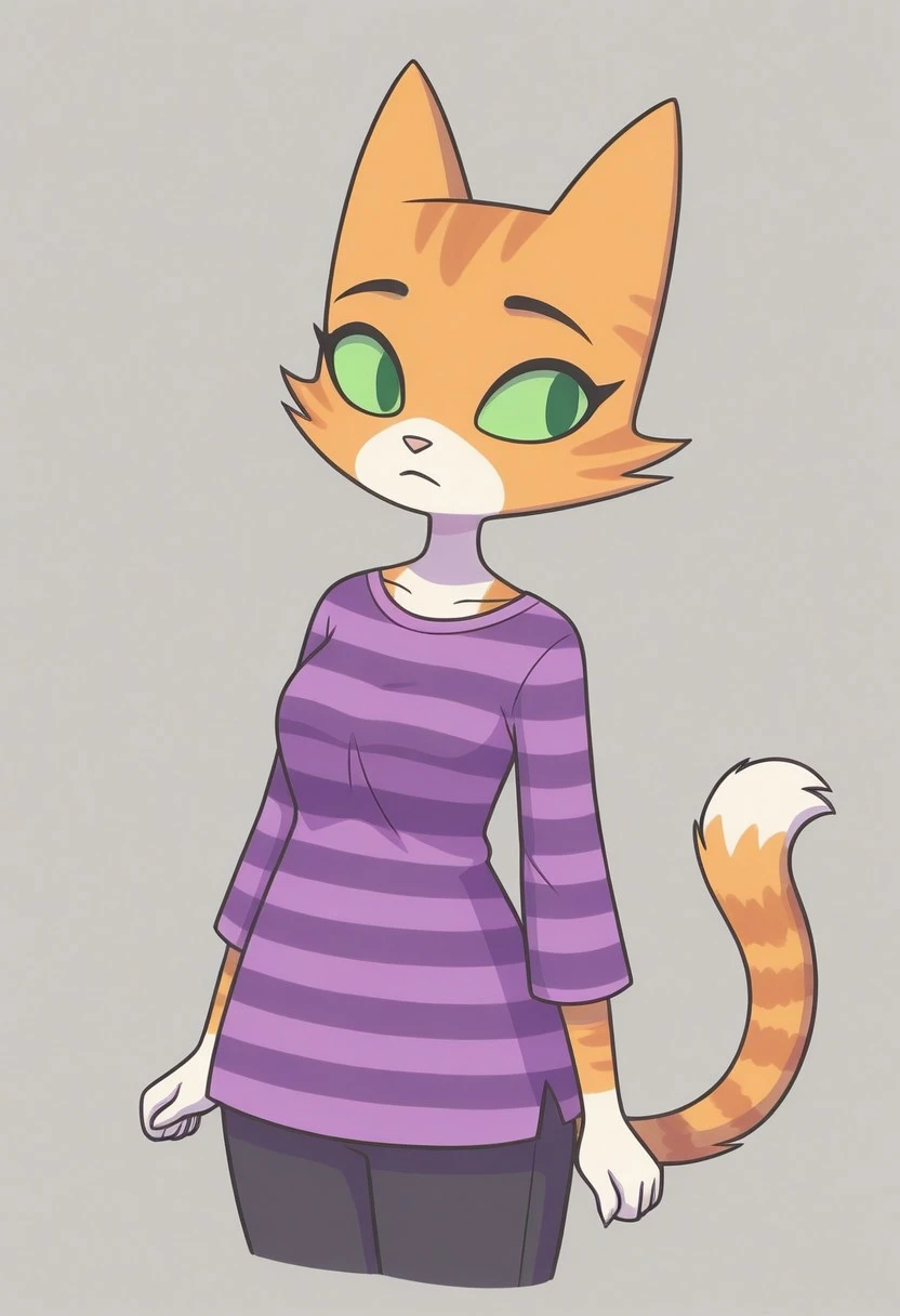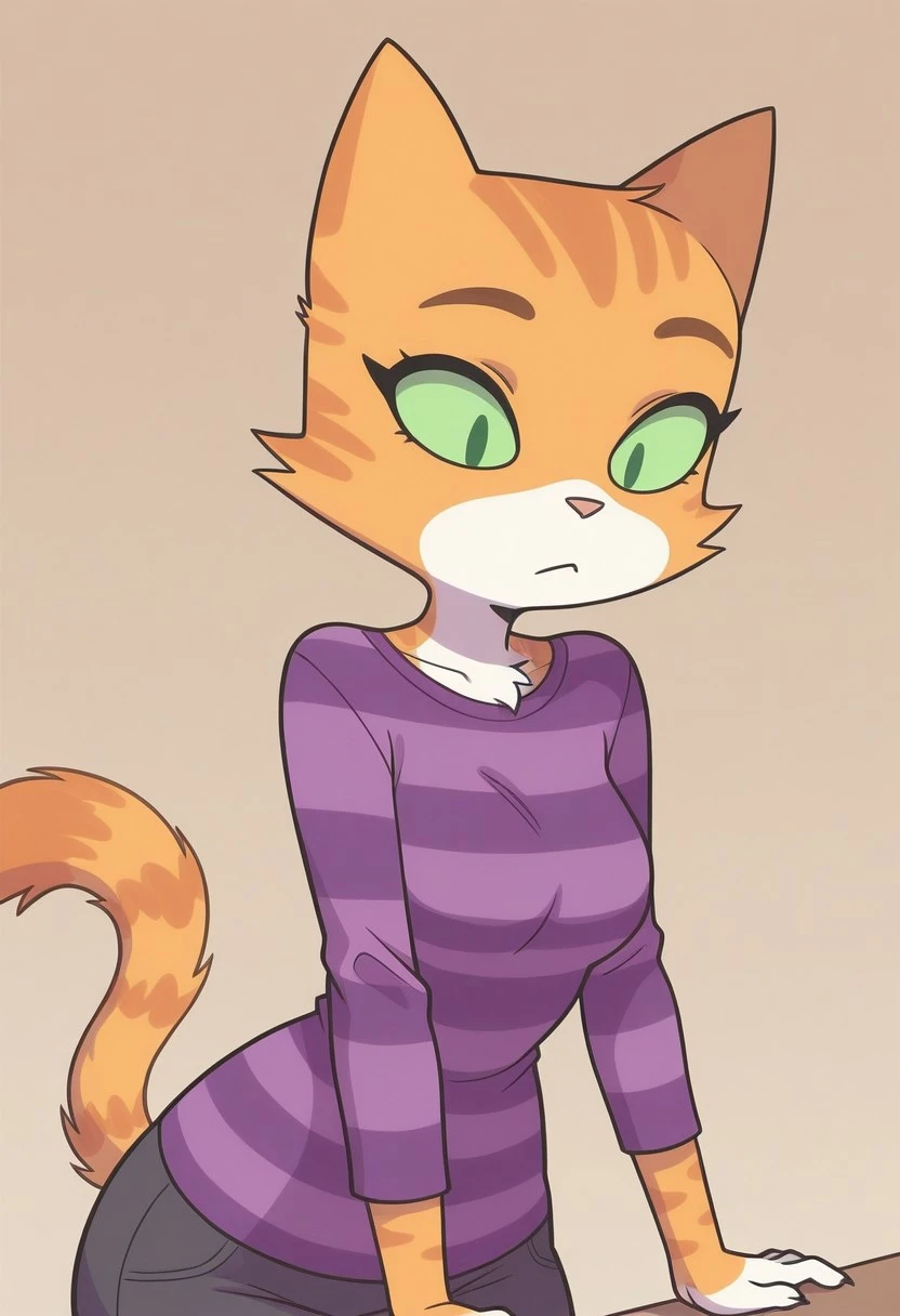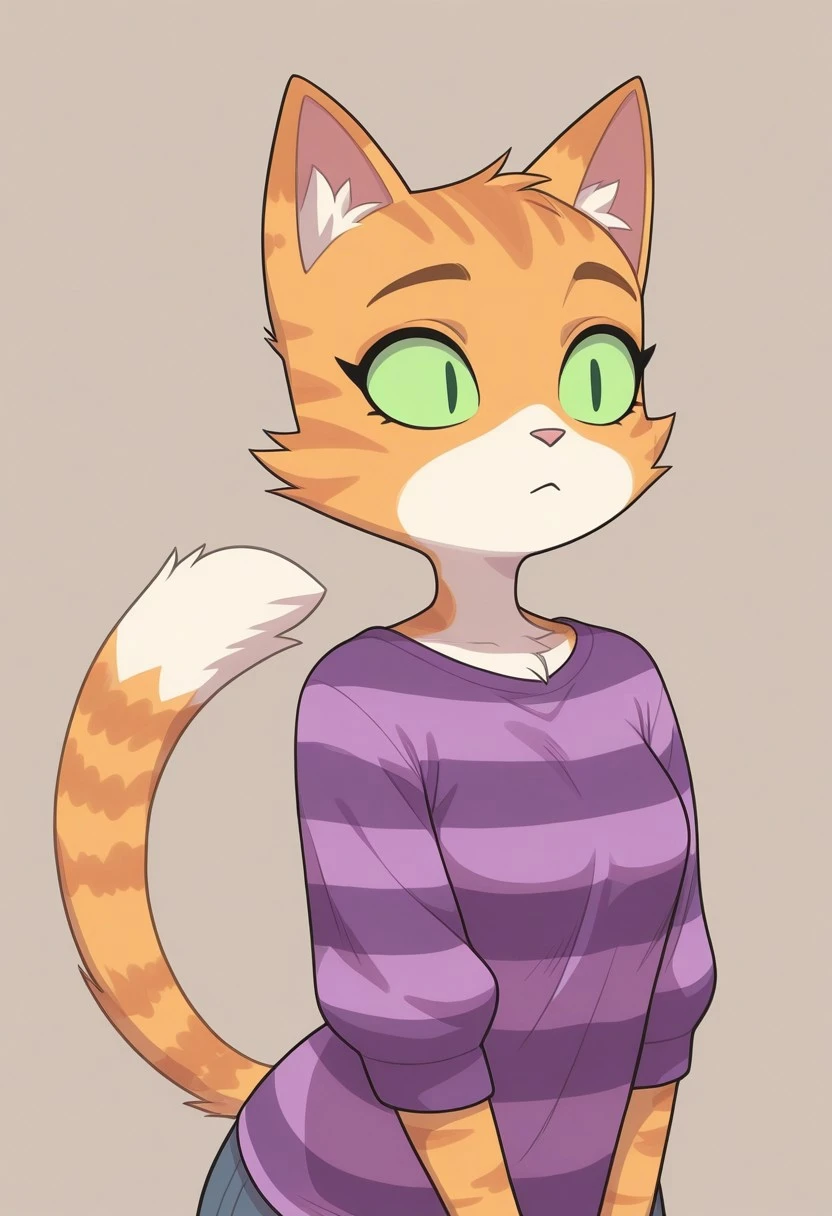furry,1girl,cat ears,cat tail,striped,purple shirt,