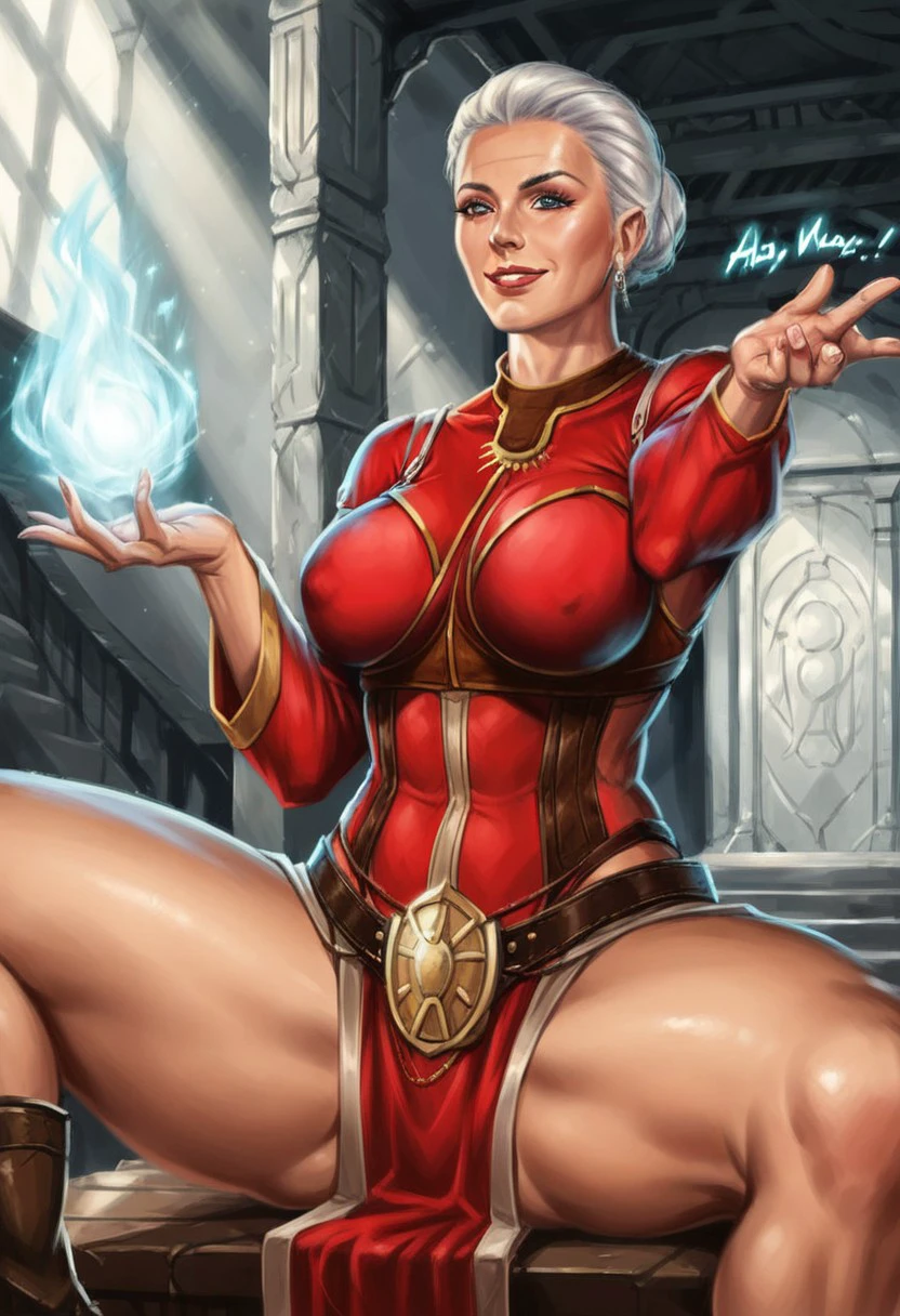 WynneDAO,1girl,solo,mature woman,white hair,short hair,large breast,armor,dress,jewelry,lips,staff,necklace,boots,belt,long skirt,corset,long sleeves,cuff,collar,