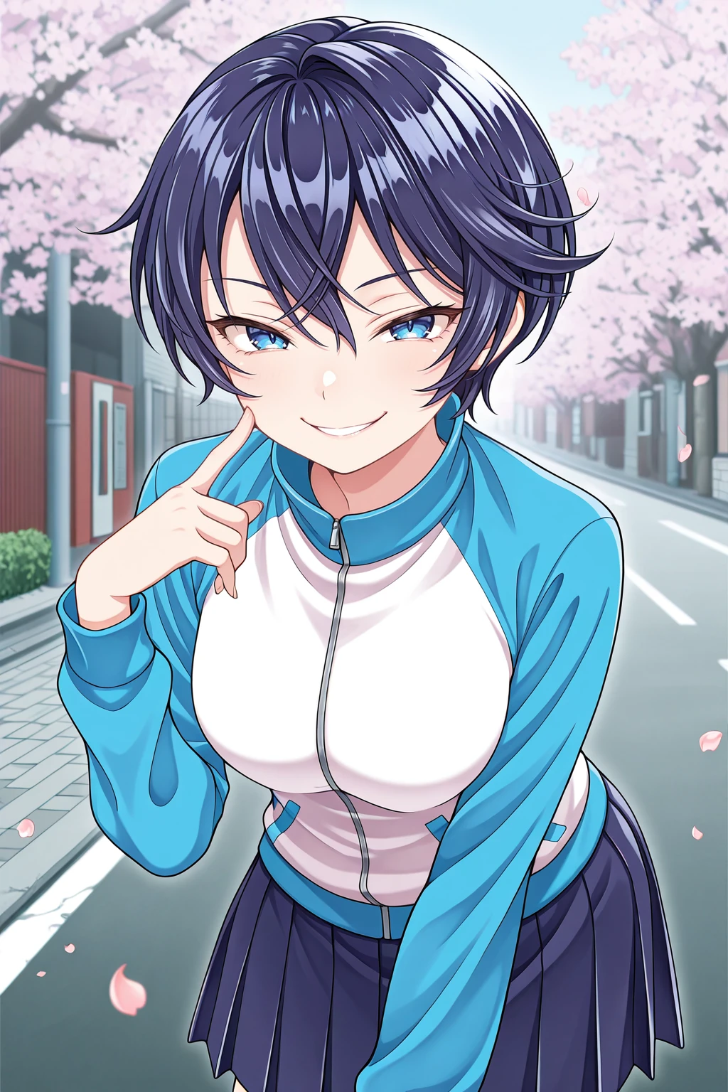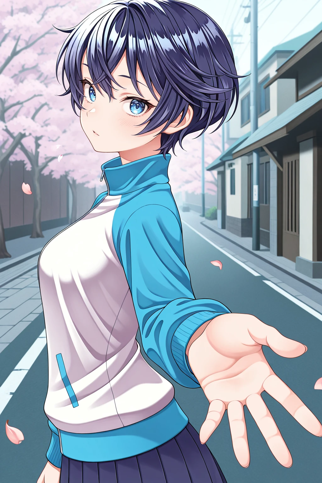 track jacket, long sleeves, reglan sleeves, blue skirt, pleated skirt