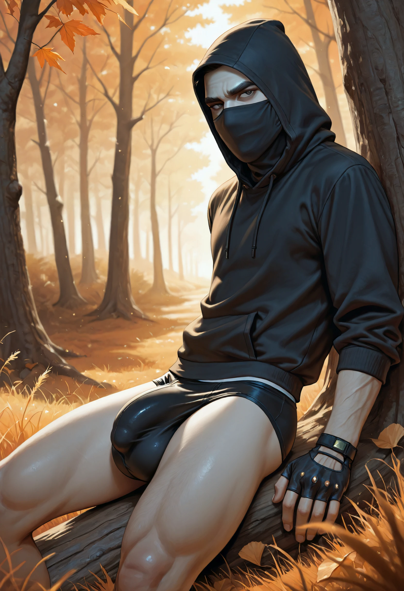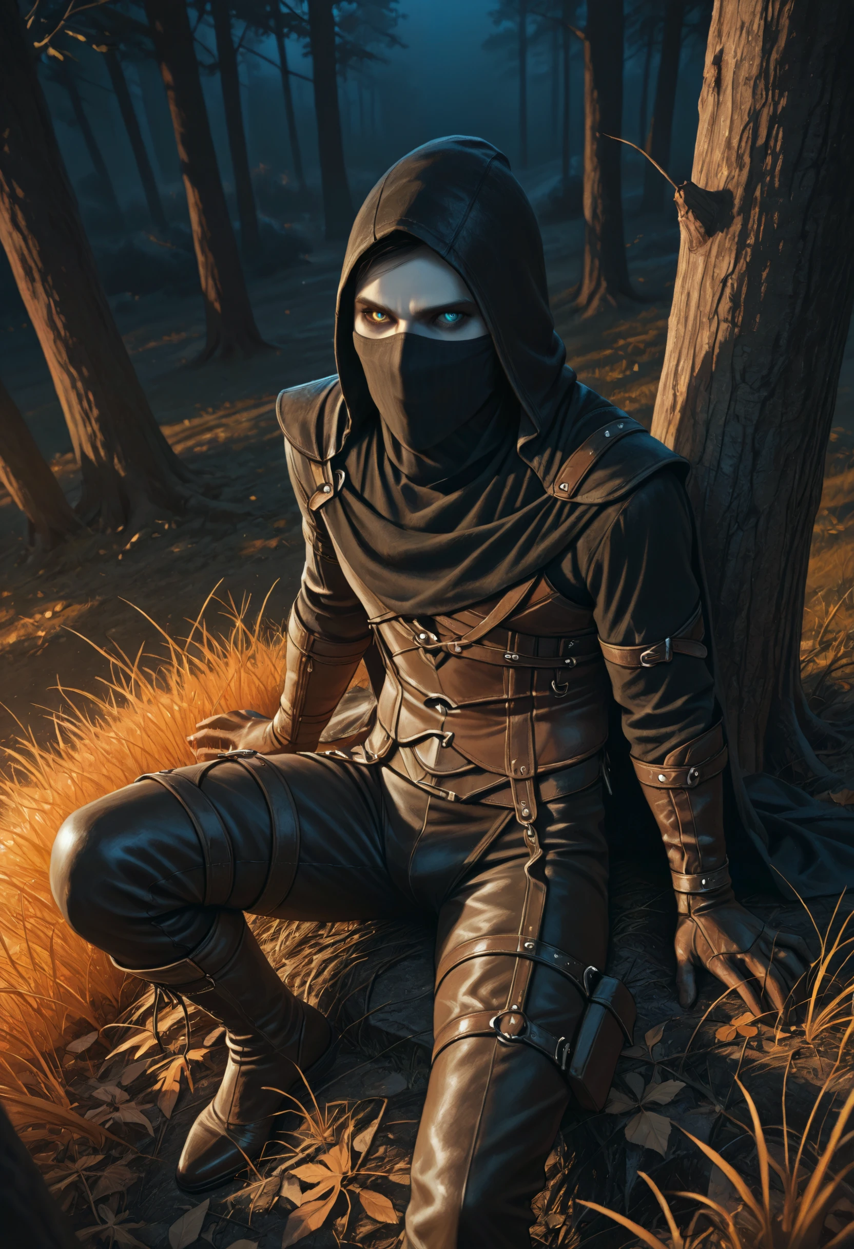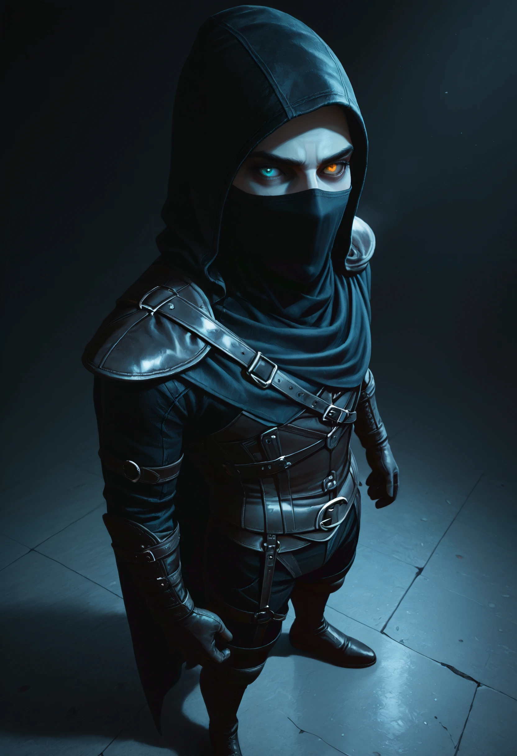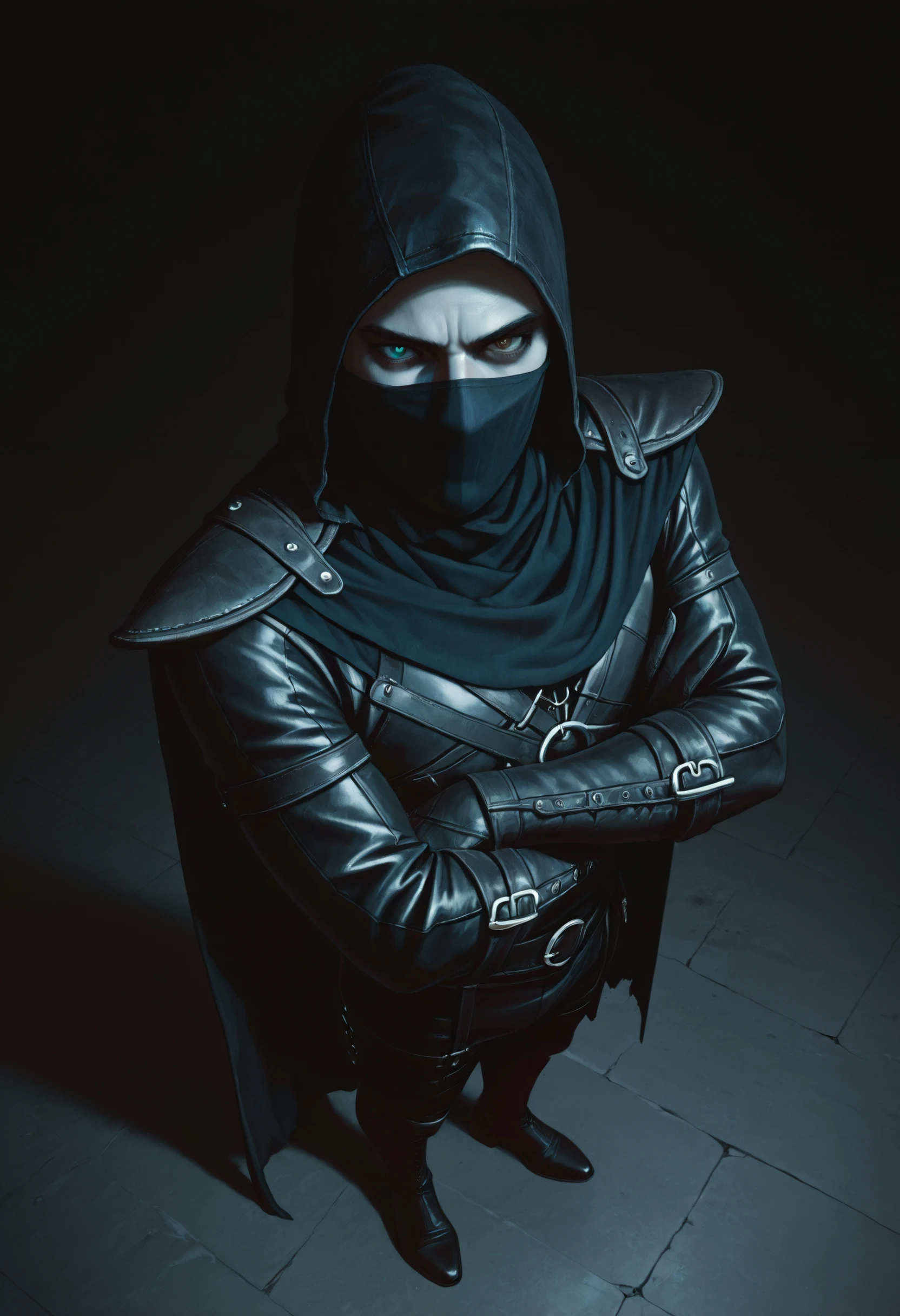 Trigger words for armor: cloth face mask, hooded rogue, dark leather hood, hood up, gloves, layered leather armor, tall strapped boots,