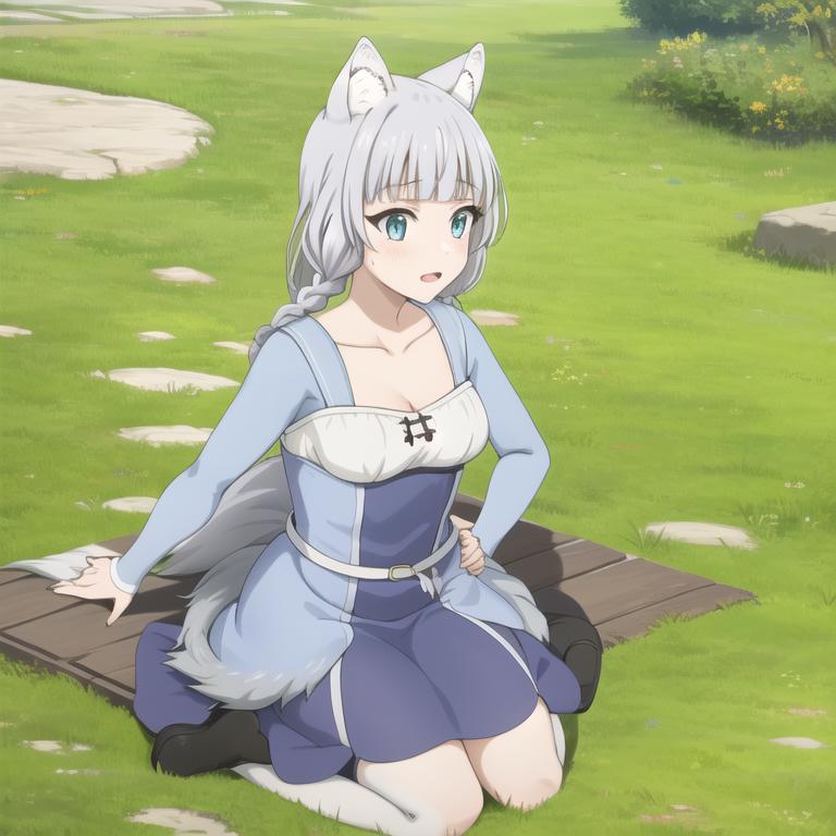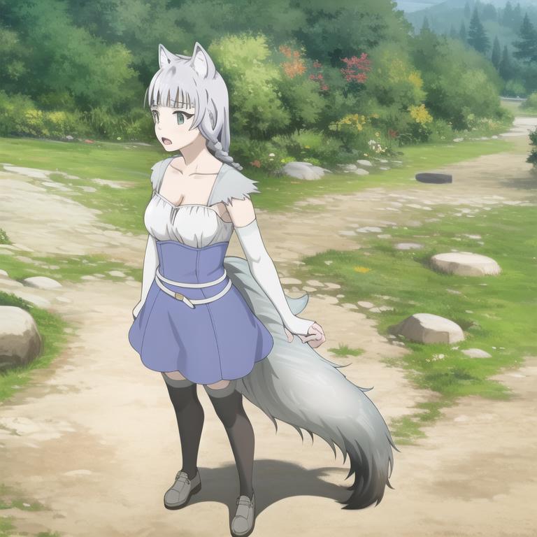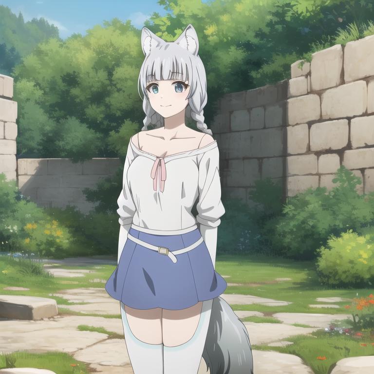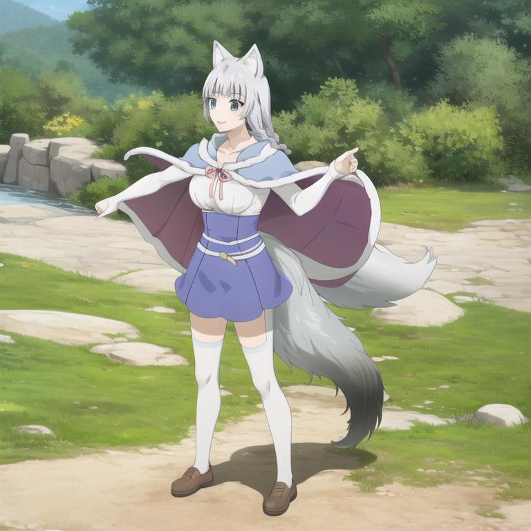 Trigger Word: kemonomichi-shigure, wolf ears, wolf tail, cape, white shirt, blue skirt