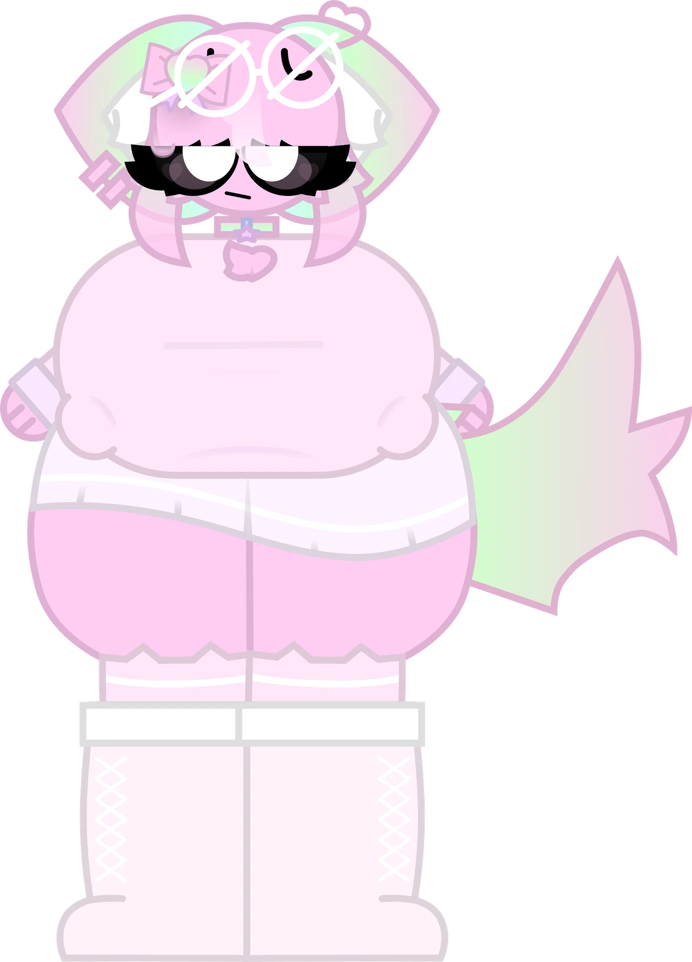 solo, looking at viewer, smile, open mouth, simple background, gloves, bow, animal ears, jewelry, standing, tail, full body, pink hair, multicolored hair, heart, :3, boots, glasses, fingerless gloves, collar, white footwear, sunglasses, white skirt, eyewear on head, colored sclera, round eyewear, dog tail, furry female, white eyes, pink skin, heart-shaped eyewear, pink-framed eyewear, pink tail, shirt, hair bow, clenched hands, pink shirt