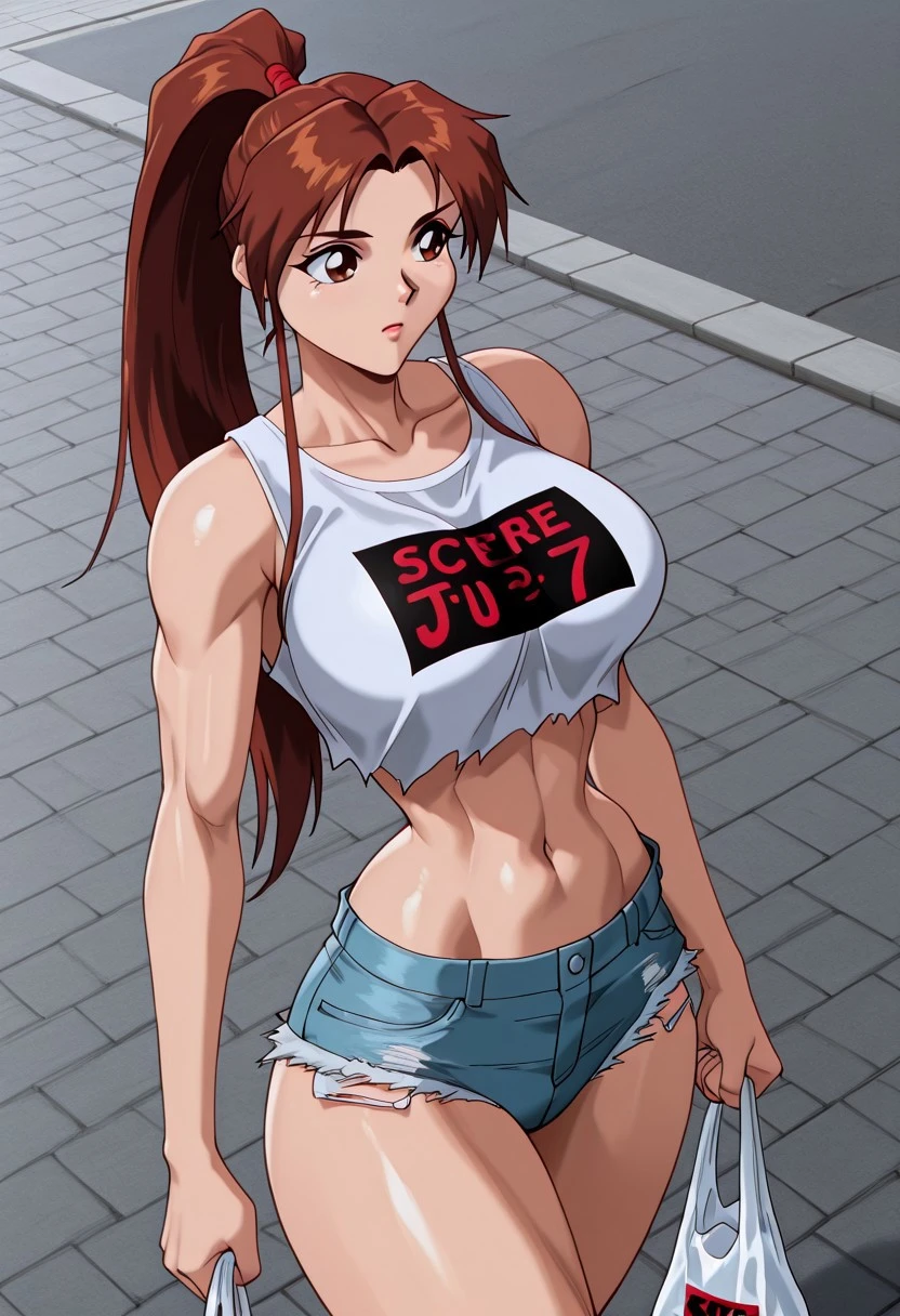 white t shirt, sleeveless shirt, ripped shirt, cropped shirt, bare shoulders, ripped jeans, denim jean shorts,