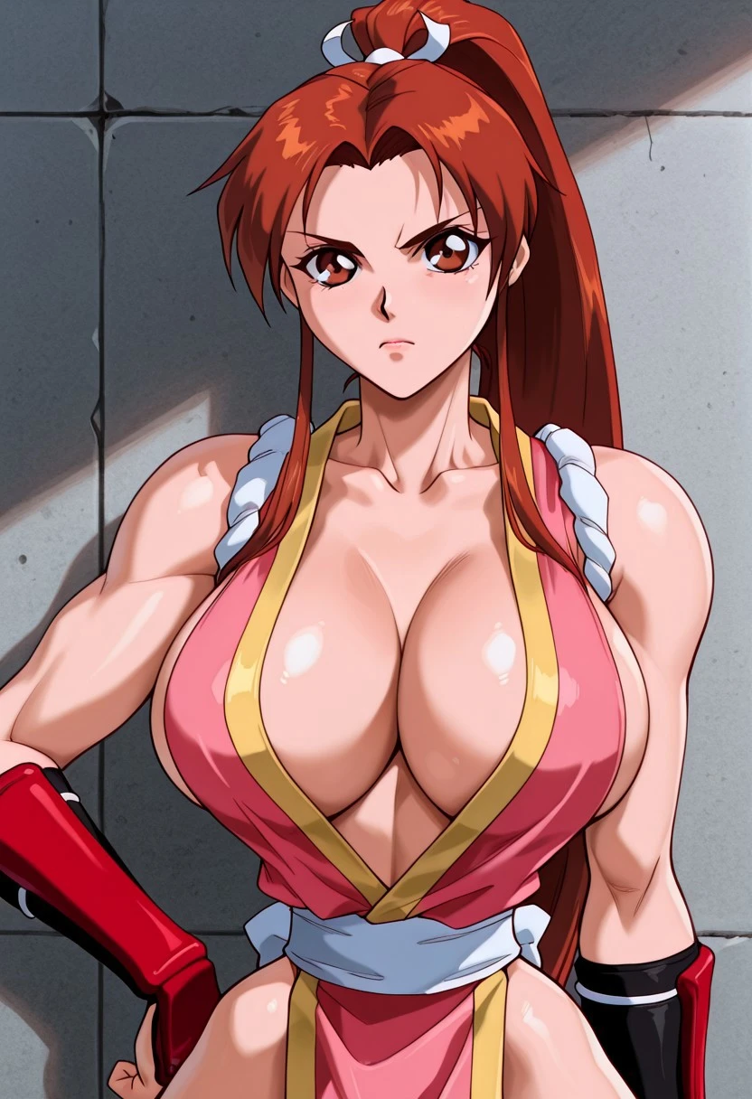 pink kunoichi dress, bare shoulders, red arm guards, yellow trim, cleavage, sideboob, collarbone, white obi,pelvic curtain, white panties, pink ribbon, white Nio-dasuki,