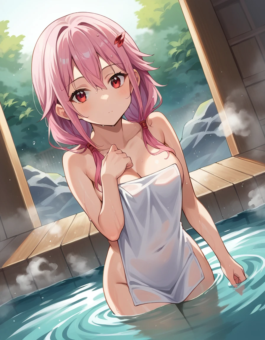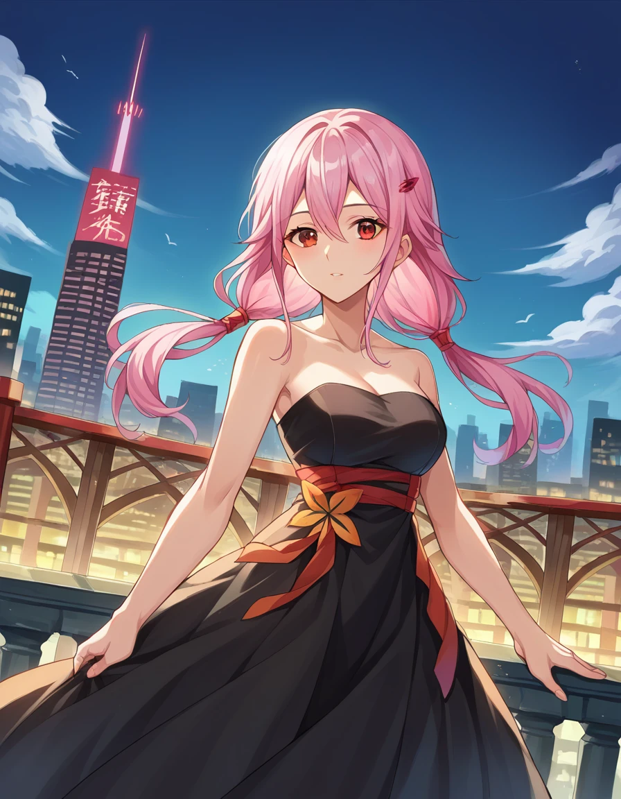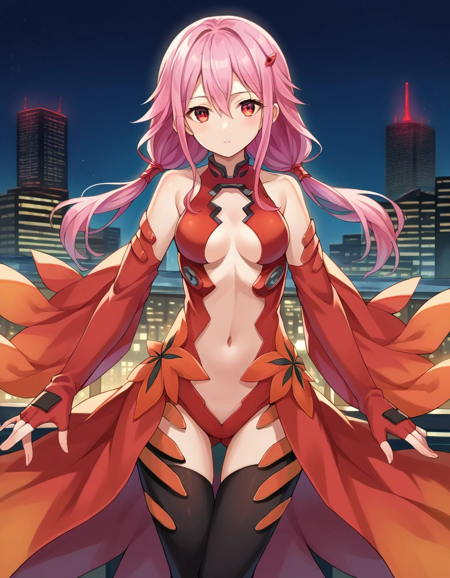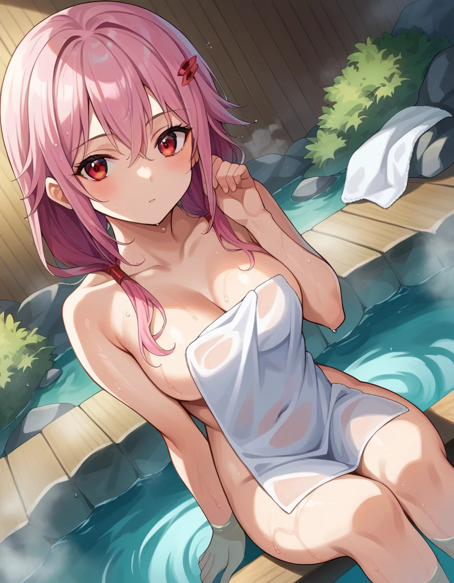 inori yuzuriha, hair ornament, hairclip, long hair, pink hair, red eyes, twintails,