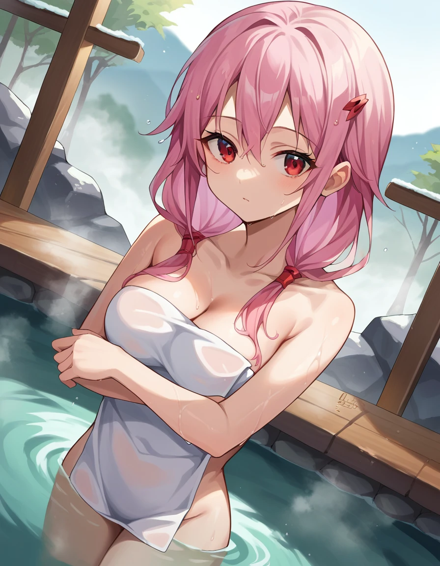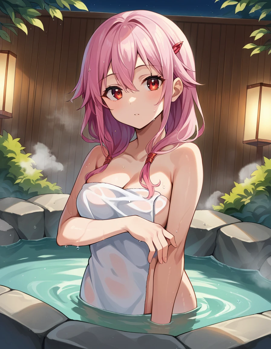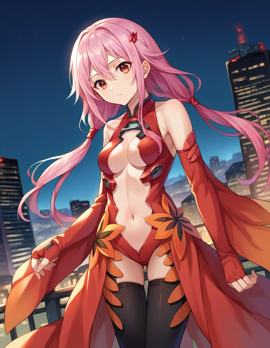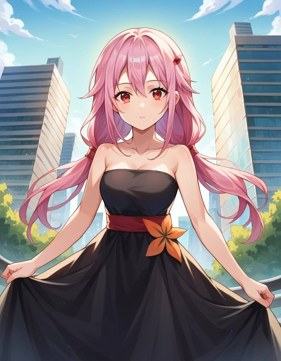 inori yuzuriha, hair ornament, hairclip, long hair, pink hair, red eyes, twintails,