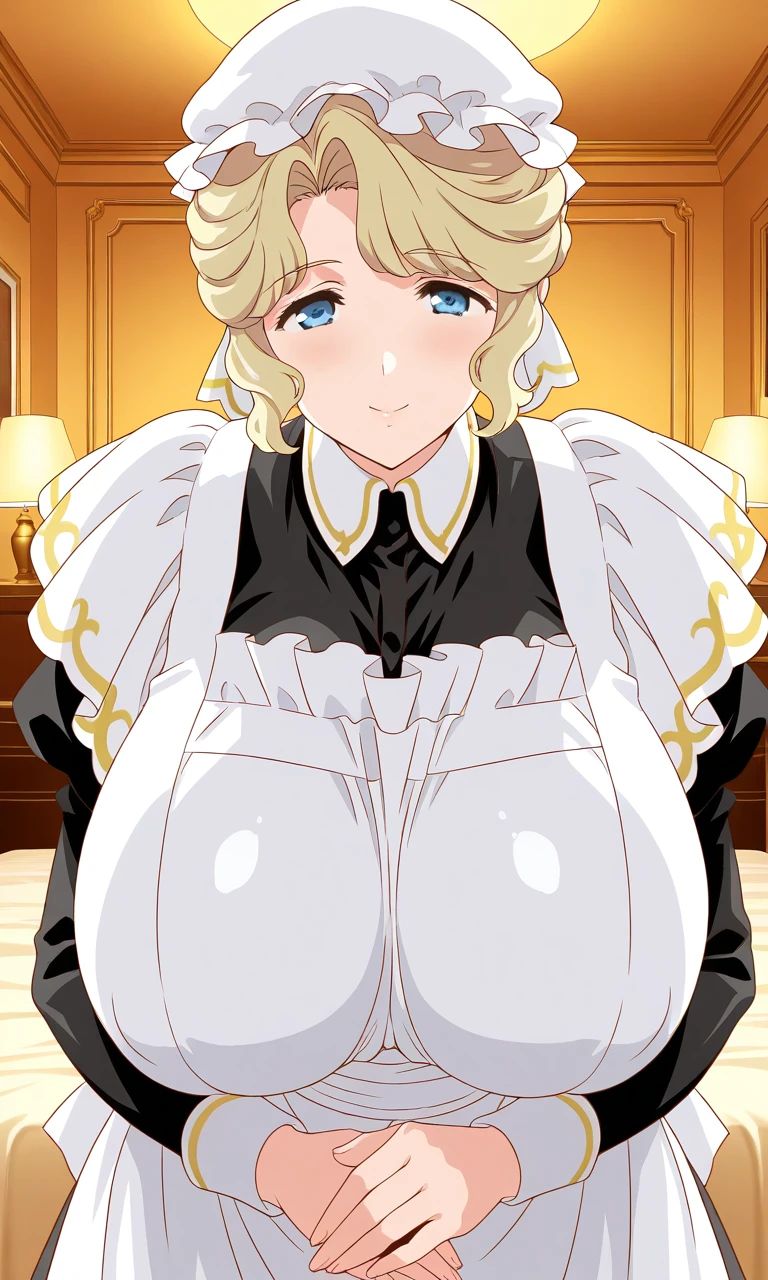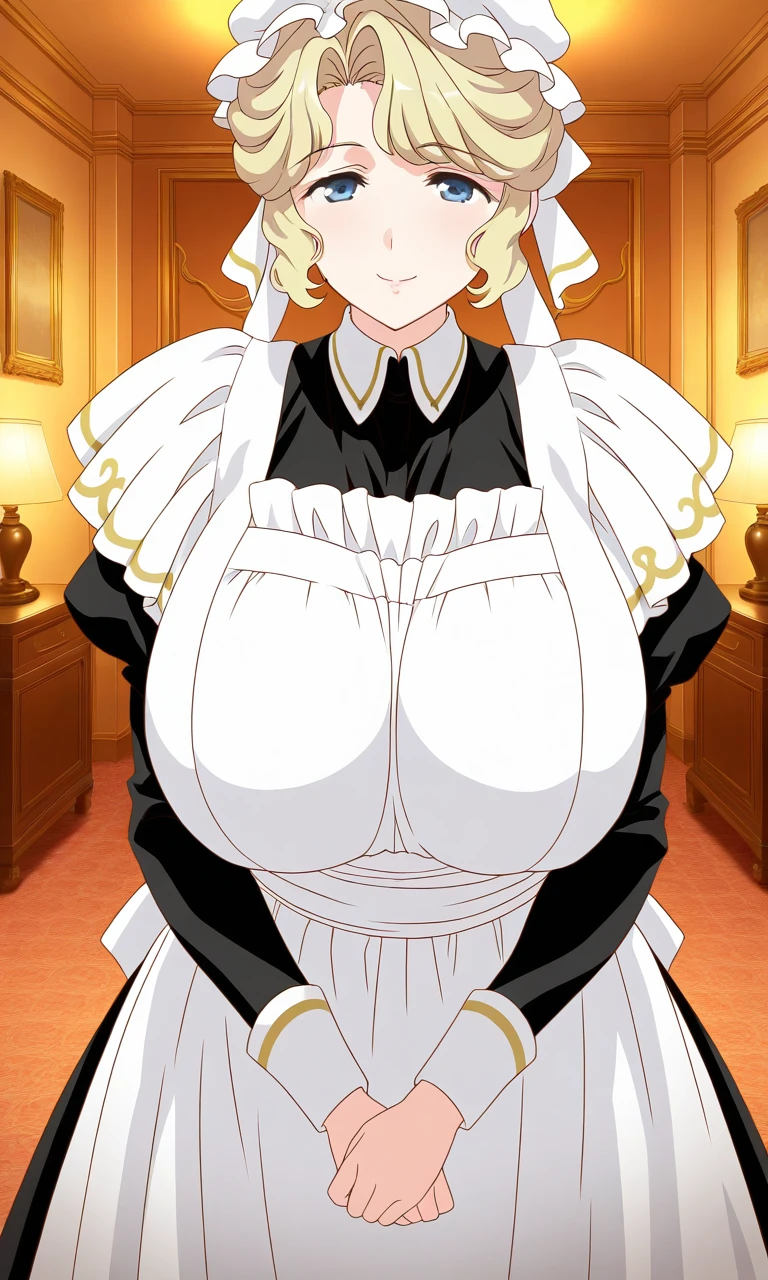 Victorian_Maid_Maria, blonde hair, blue eyes, huge breasts, short hair, mob cap,
