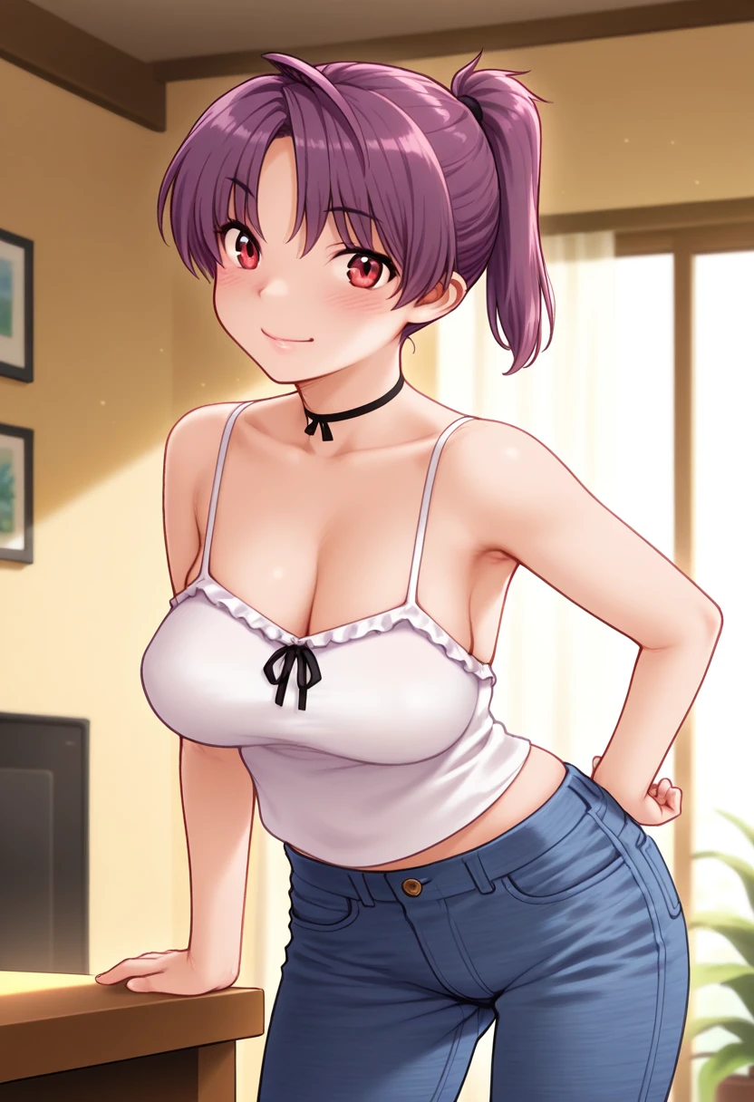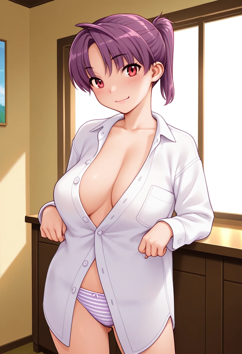 chinatsuww, red eyes, purple hair, short hair, ponytail, parted bangs, ahoge, large breasts,