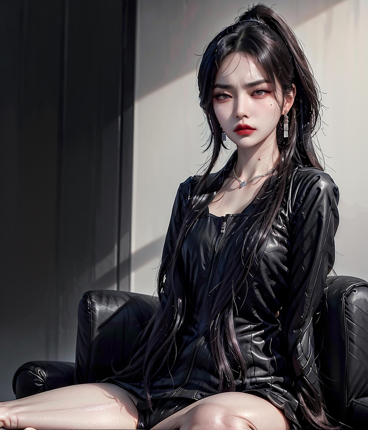(black_very_long_hair:1.3),(wavy hair),(wolf_ponytail:1.1),(long_eyes:1.2), (pink_gloss_eyeshadow:1.2), (scarlet_lips:1.4),makeup, (eyes in shadow), (half-closed eyes:1.3), (empty eyes),(black_open_jacket), black pants,