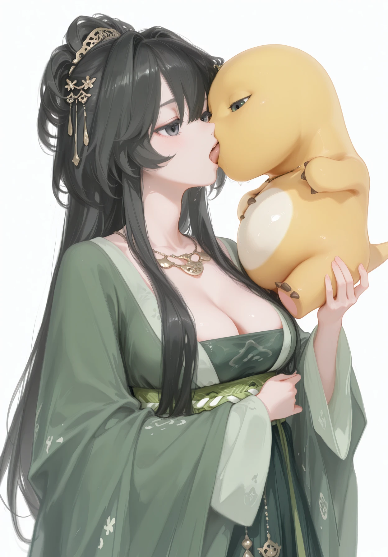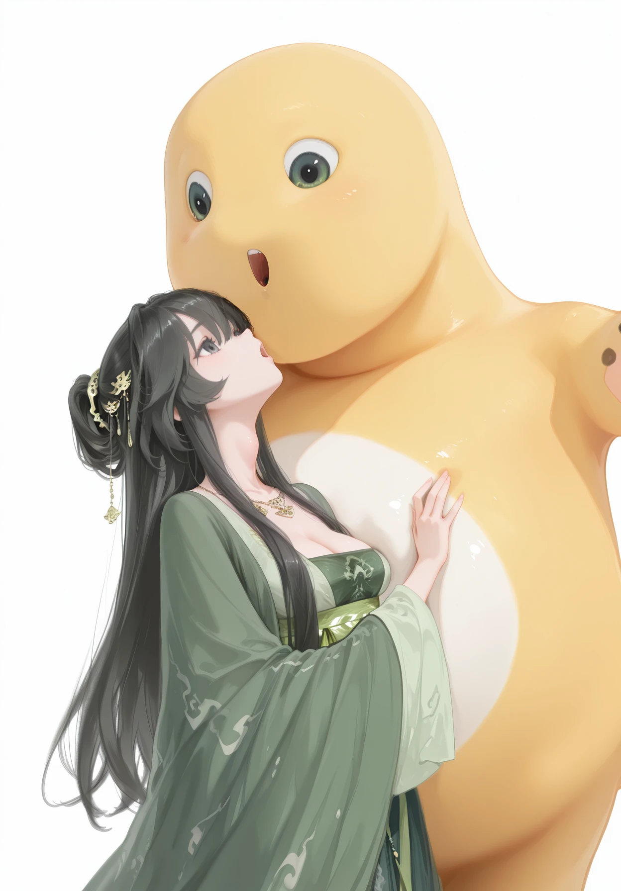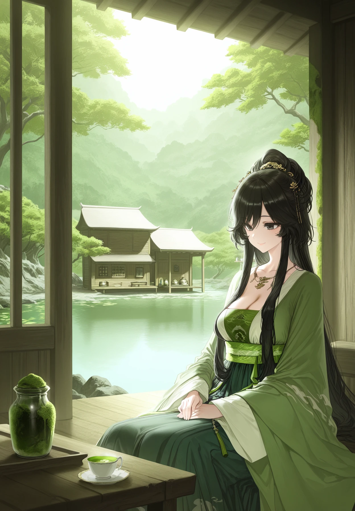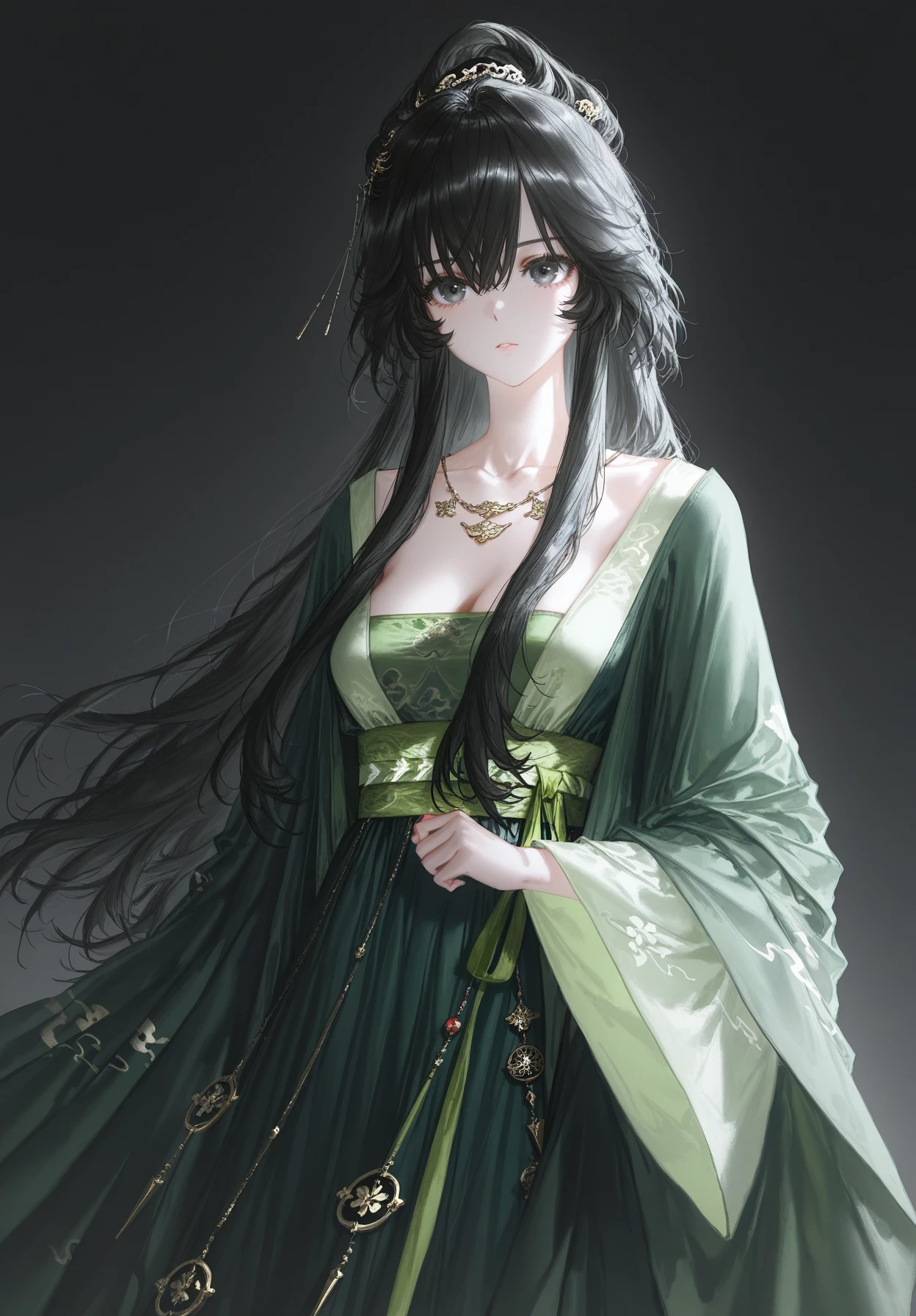 linpianpian,1girl,black hair,long hair,high ponytail,long sidelocks,hair between eyes,black eyes,hair ornament,gold necklace,green hanfu,green strapless dress,wide sleeves,green sash,jewelry,