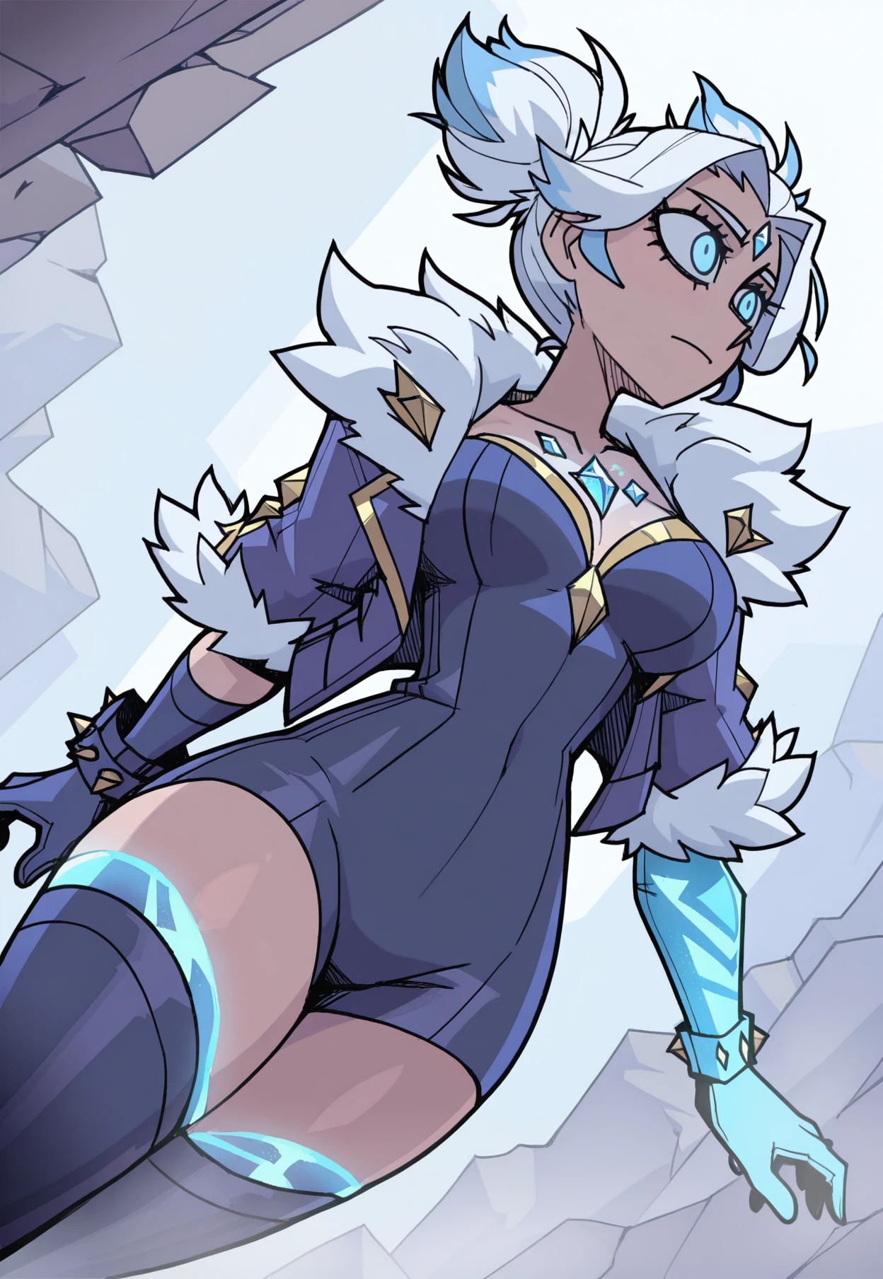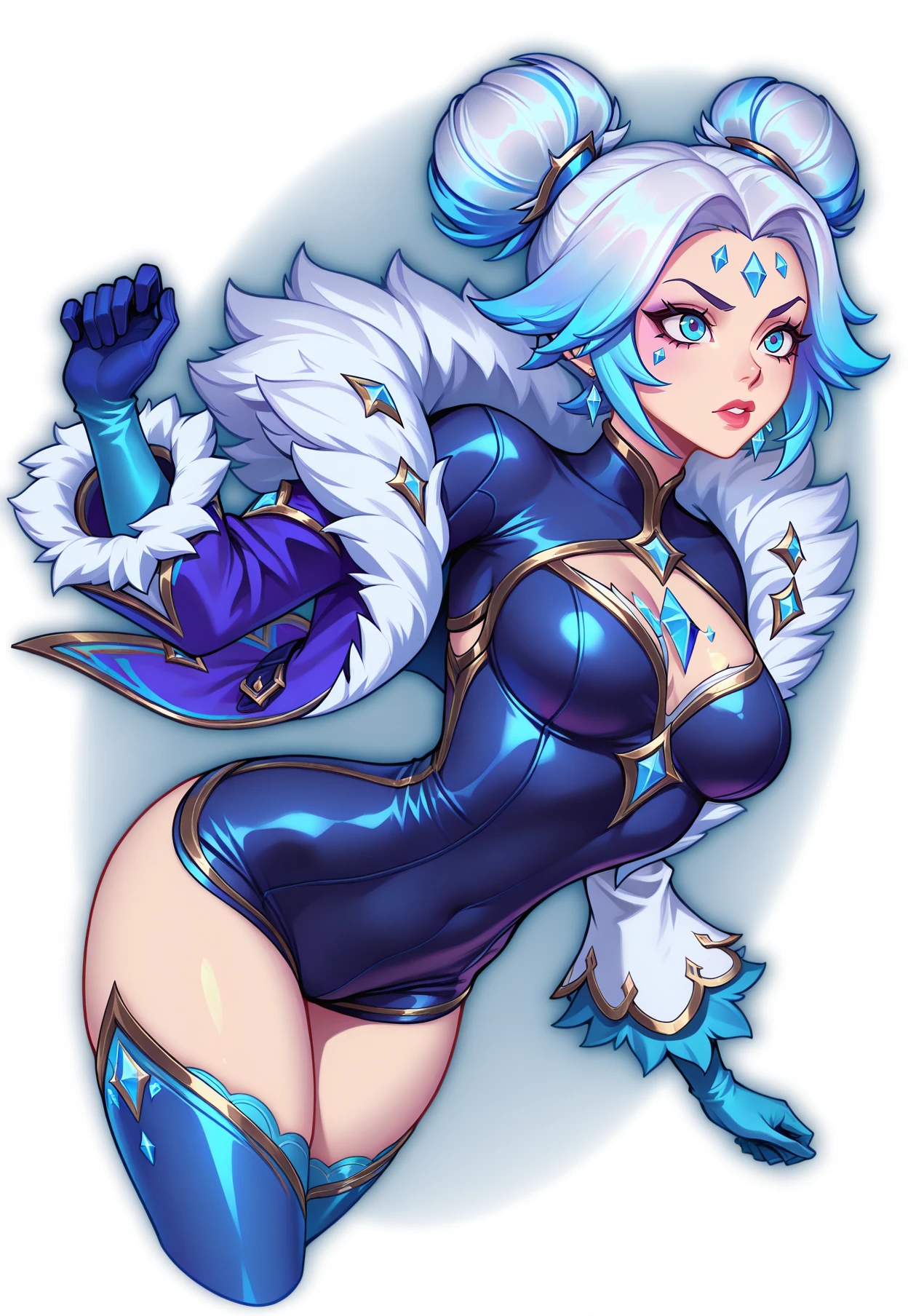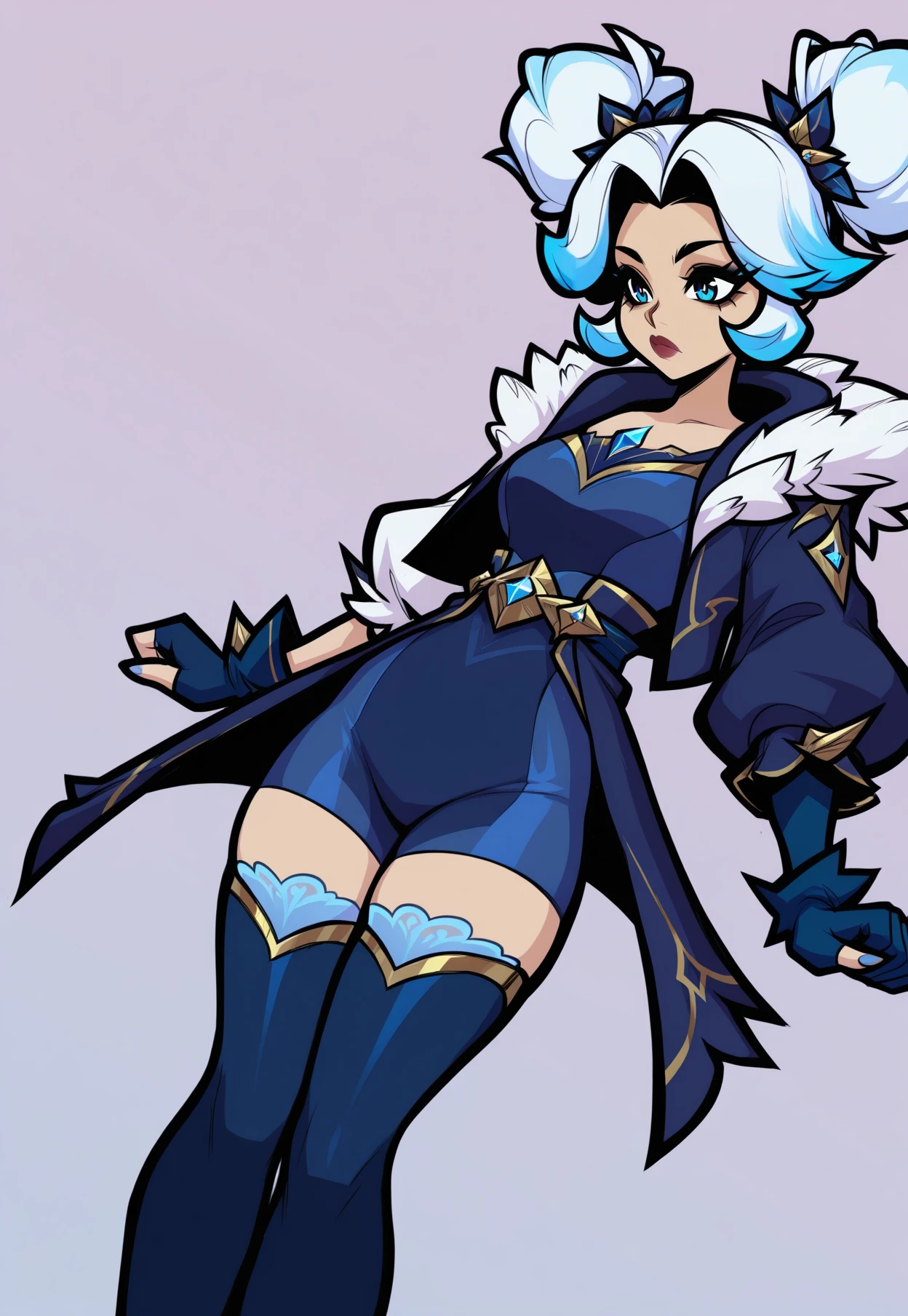WW_Zeri, white hair, blue hair tips, short hair, twin buns, blue eyes, blue bodysuit, gold trim, white fur trim, asymmetrical sleeves, blue gloves, blue stockings, forehead crystal, blue purple coat,