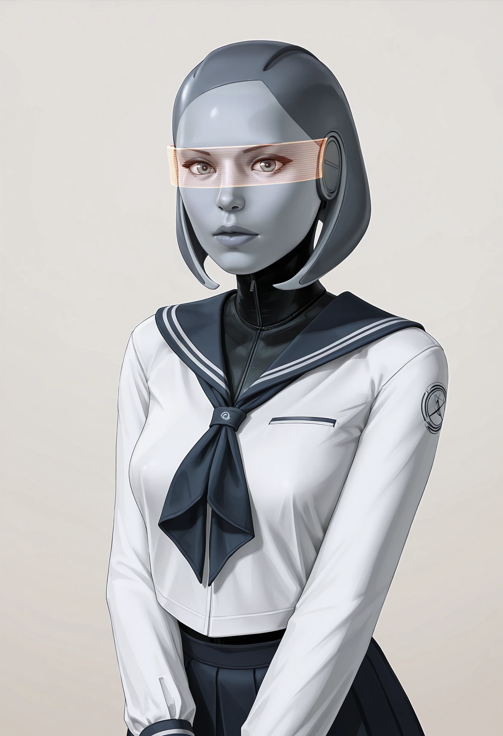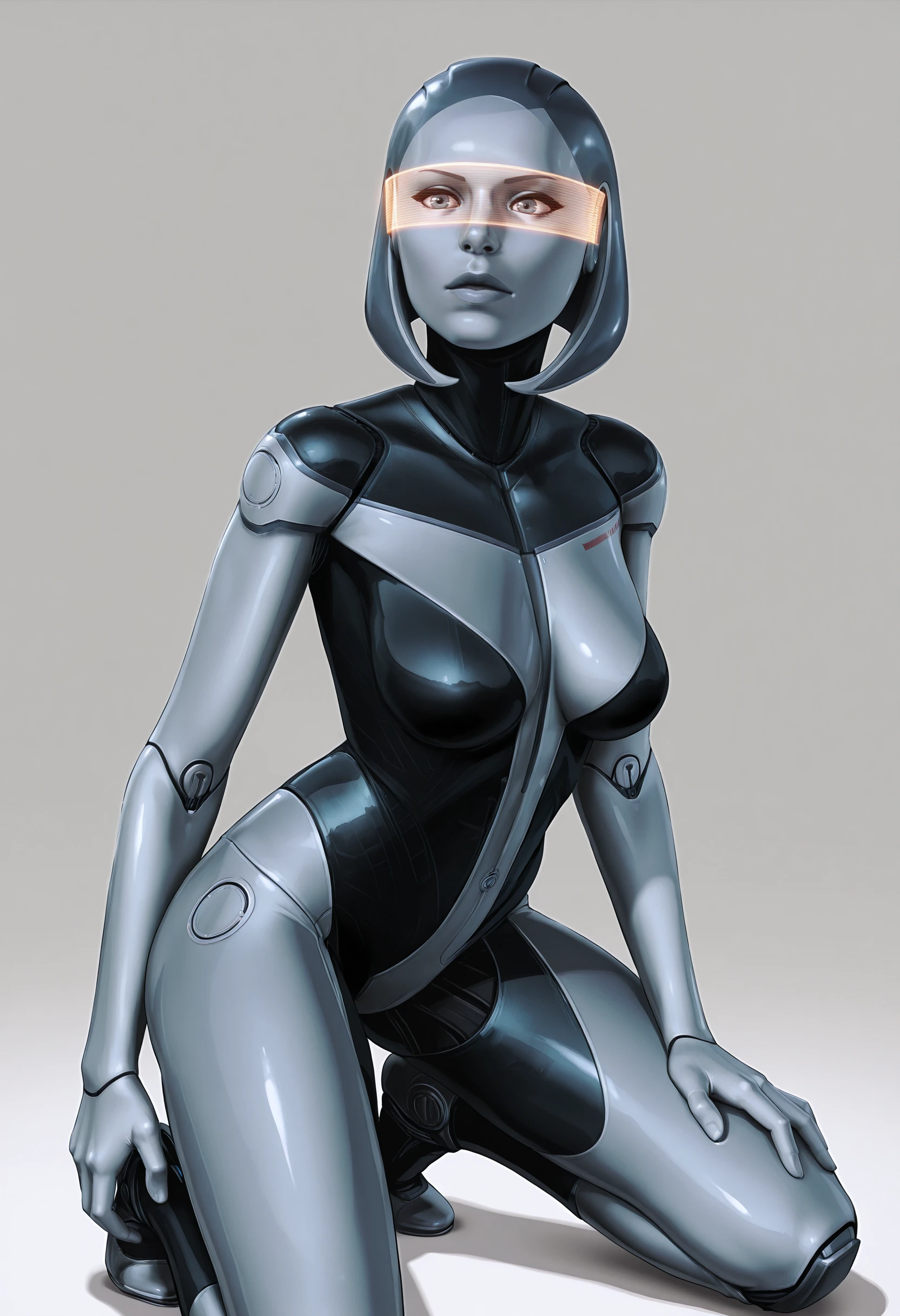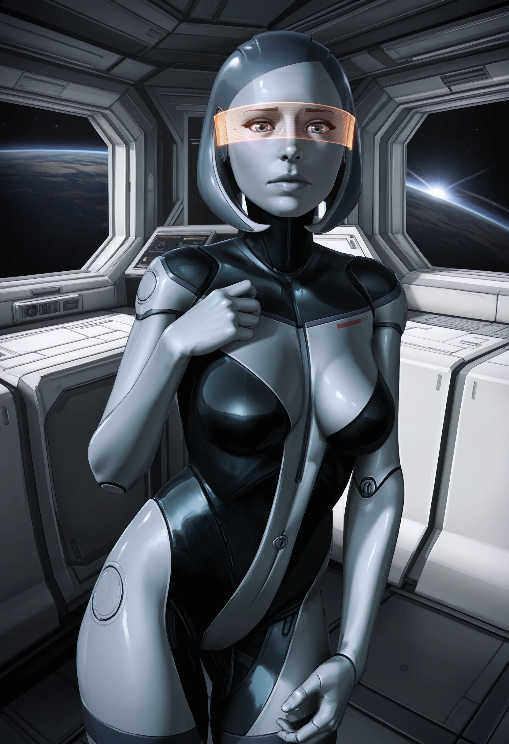 edilf, 1girl, colored skin, grey skin, lips, robot joints, bodysuit, grey eyes, visor