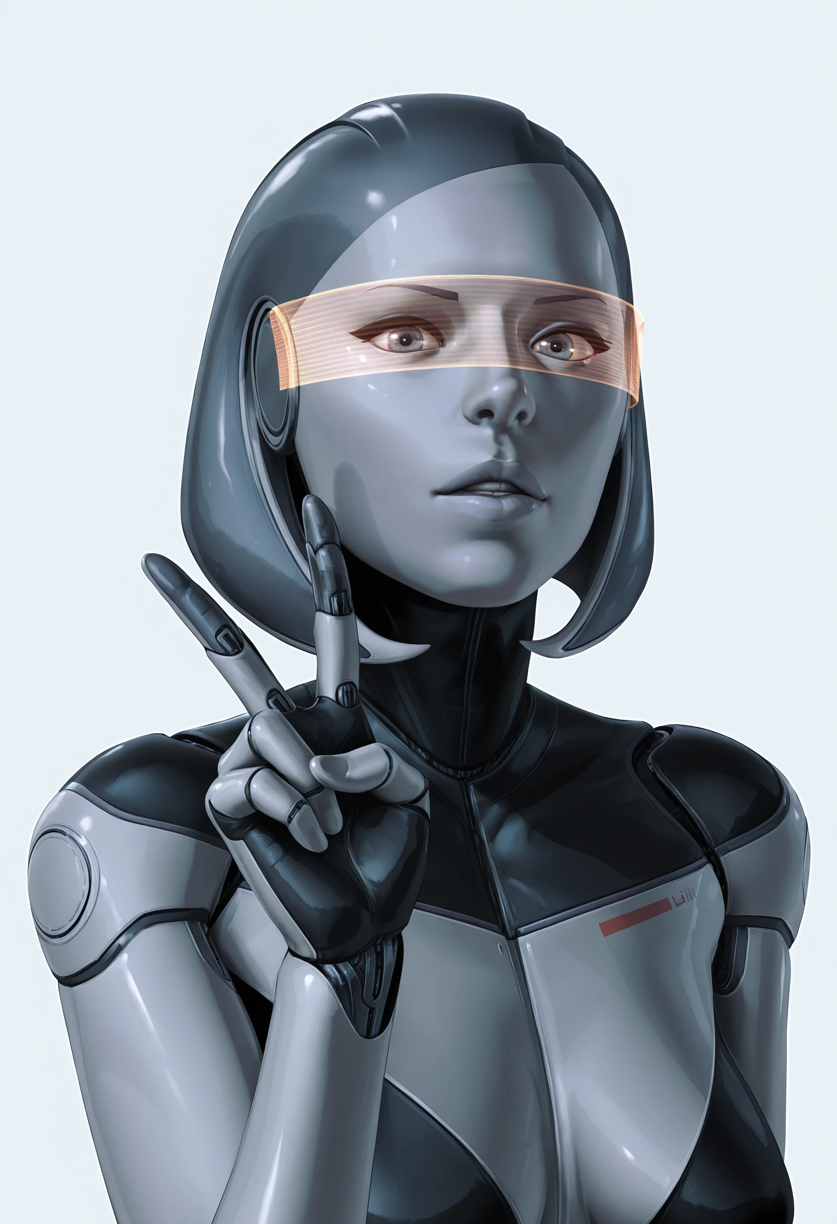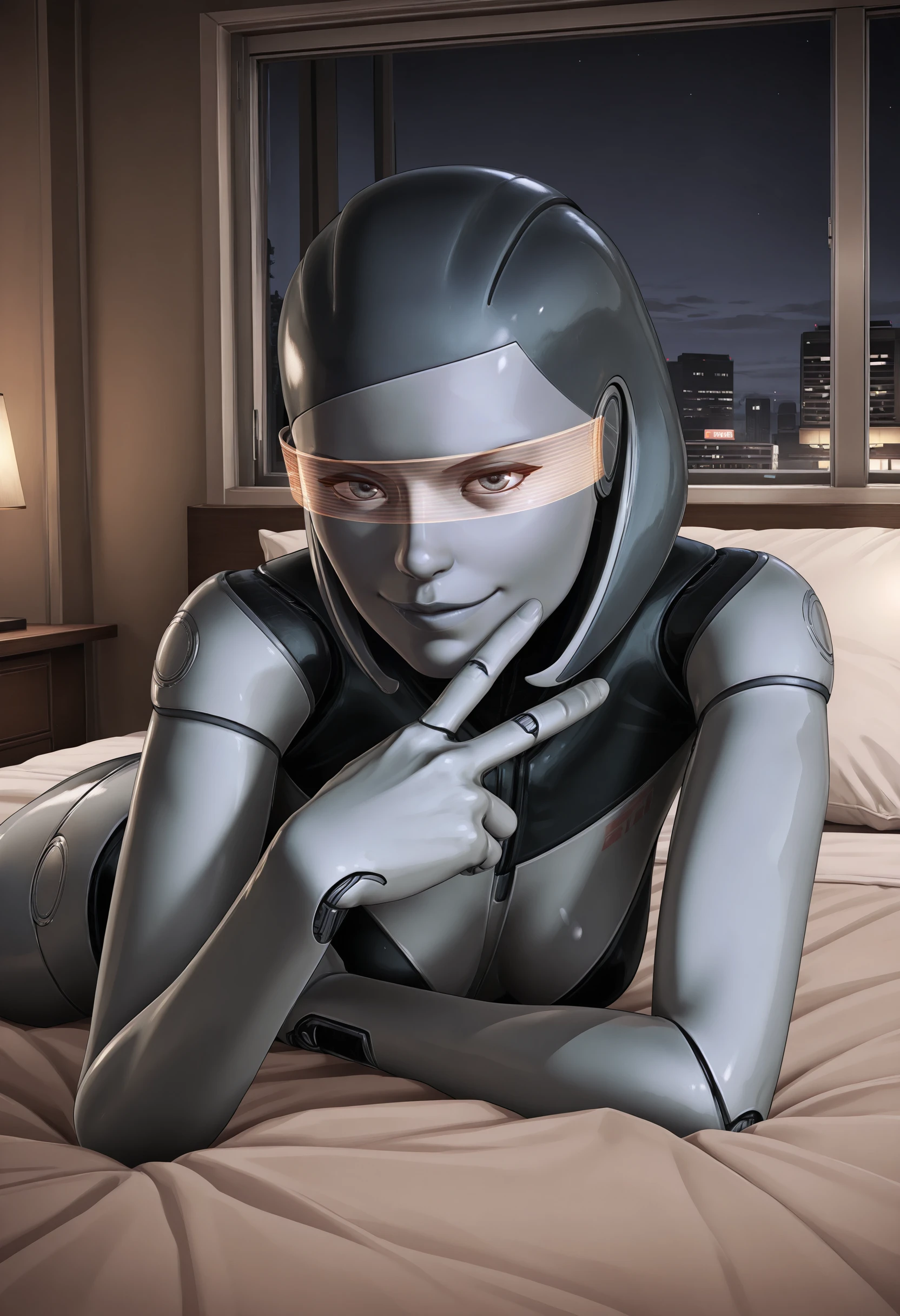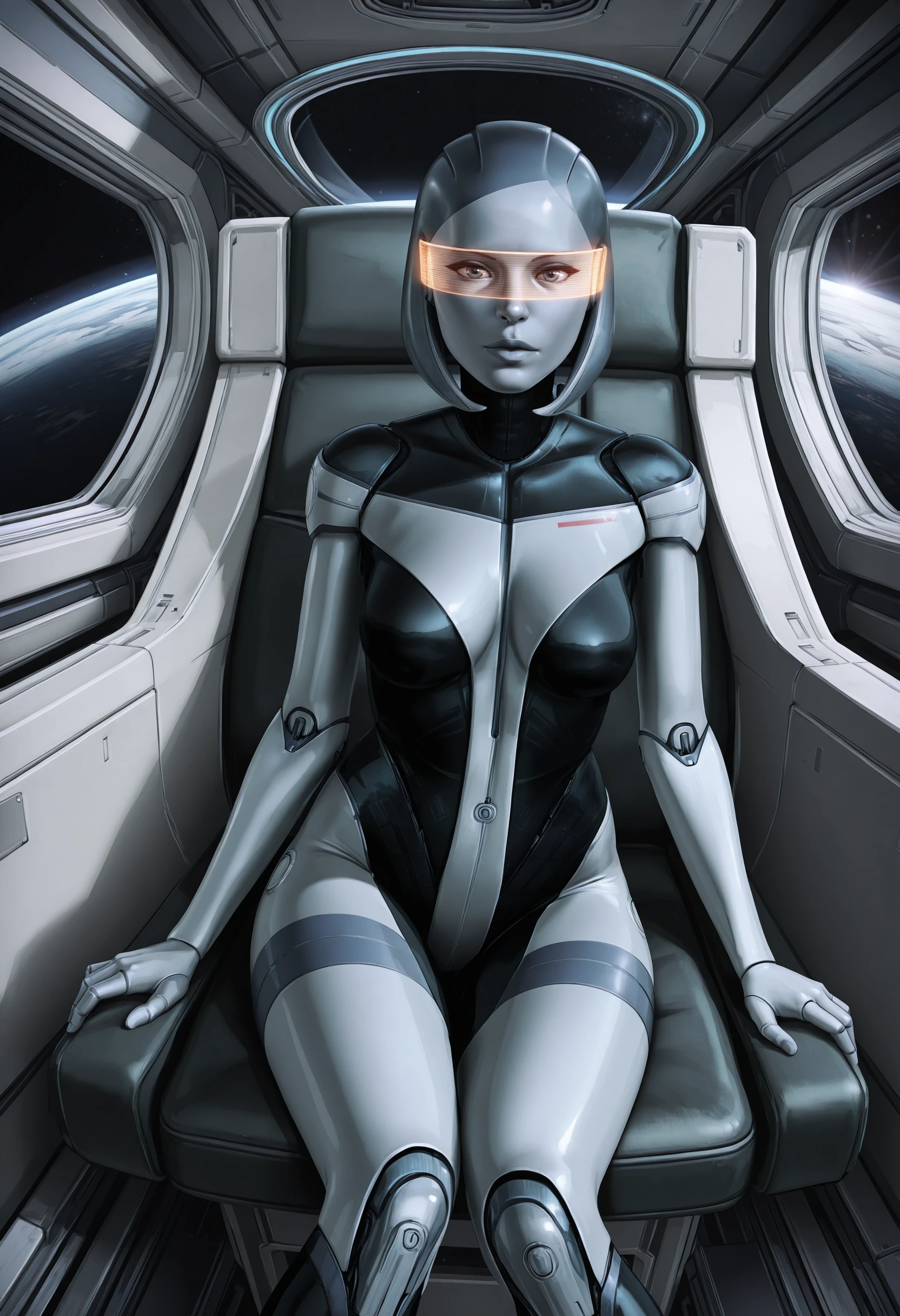 edilf, 1girl, colored skin, grey skin, lips, robot joints, bodysuit, grey eyes, visor