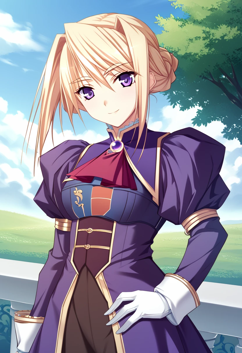 ydsylvia, 1girl, solo, blonde hair, purple eyes, hair between eyes, bangs, tied hair, side bangs