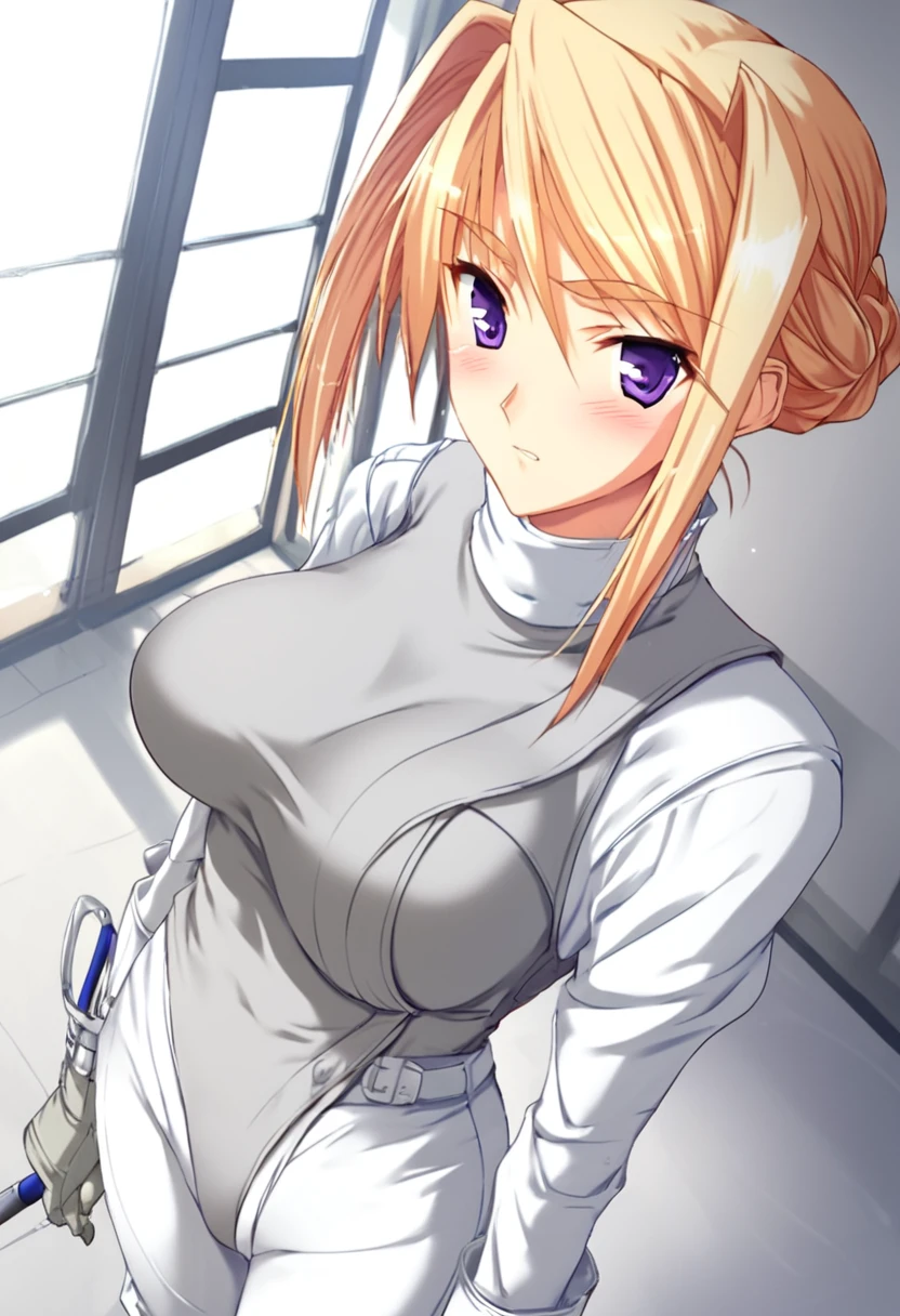 otft4, white bodysuit, fencing suit, long sleeves, grey gloves, turtleneck, skin tight