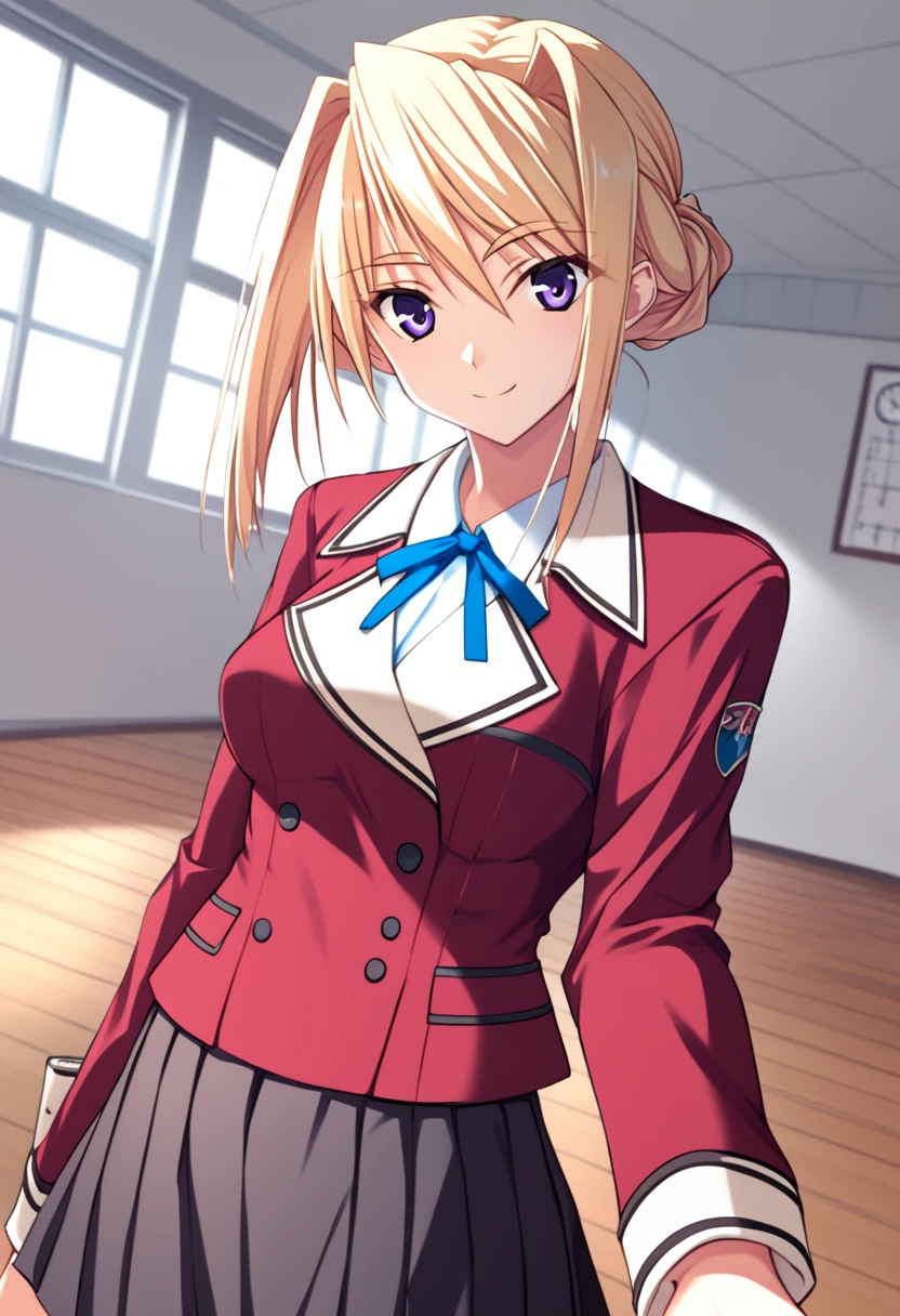 otft3, school uniform, red blazer, black skirt, pleated skirt, blue ribbon