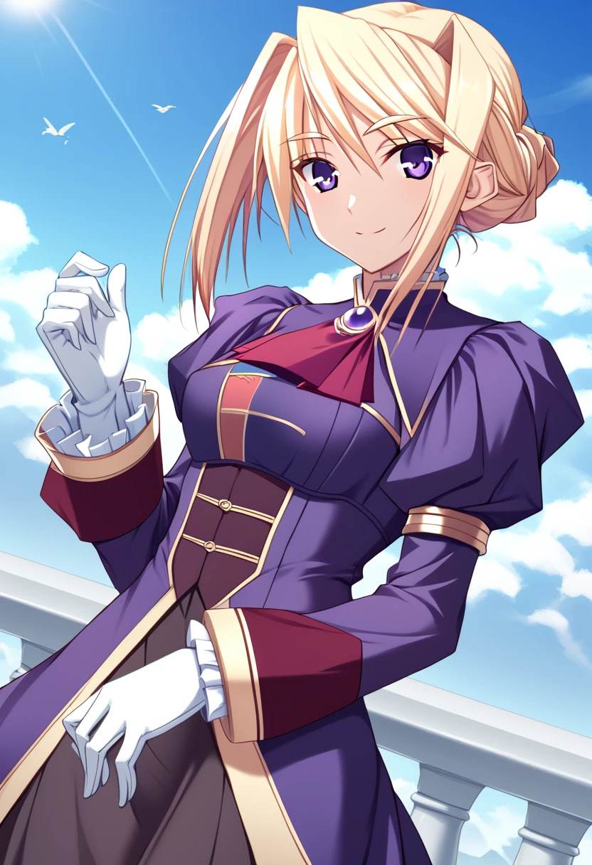 otft2, purple dress, long sleeves, puffed sleeves, red ascot, high colar, White gloves, brooch, gem, juliet sleeves, framed breasts