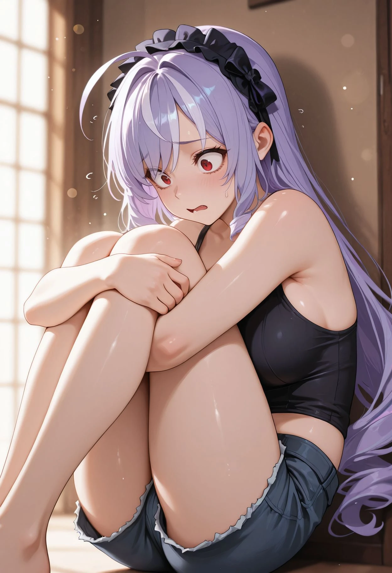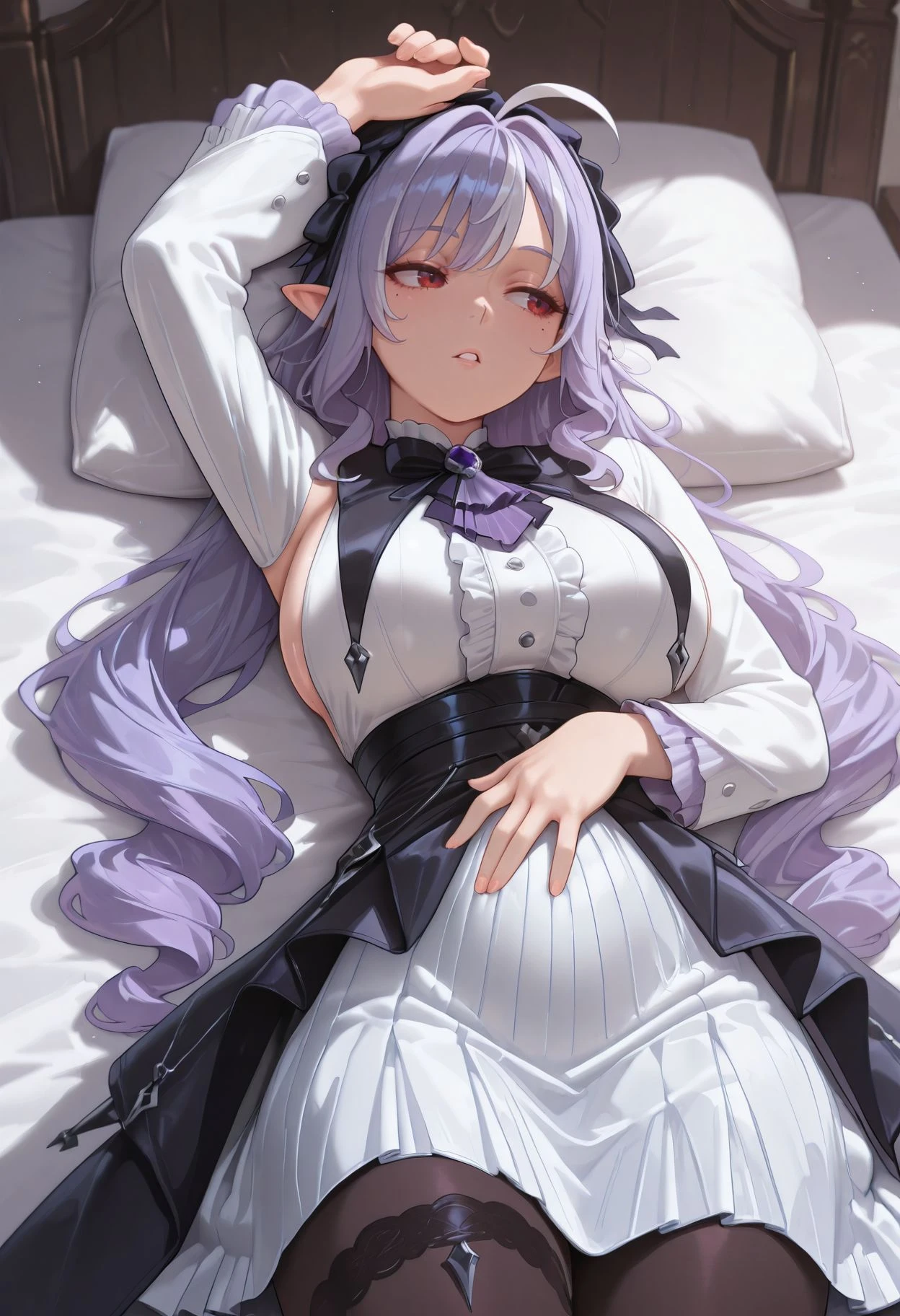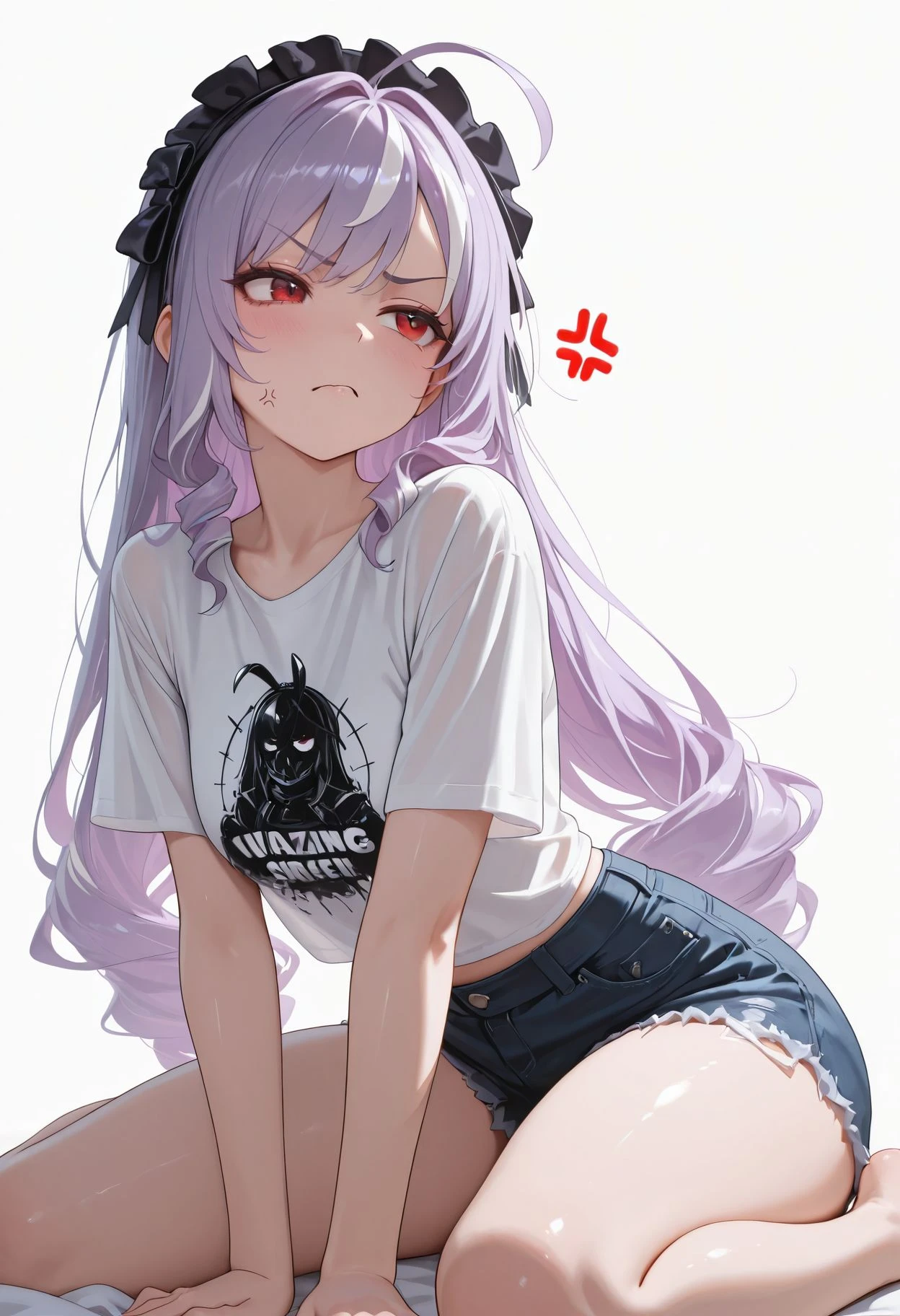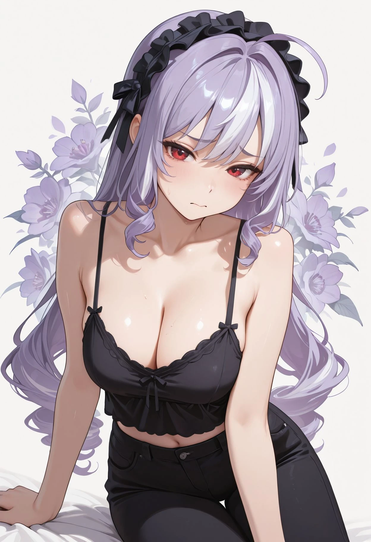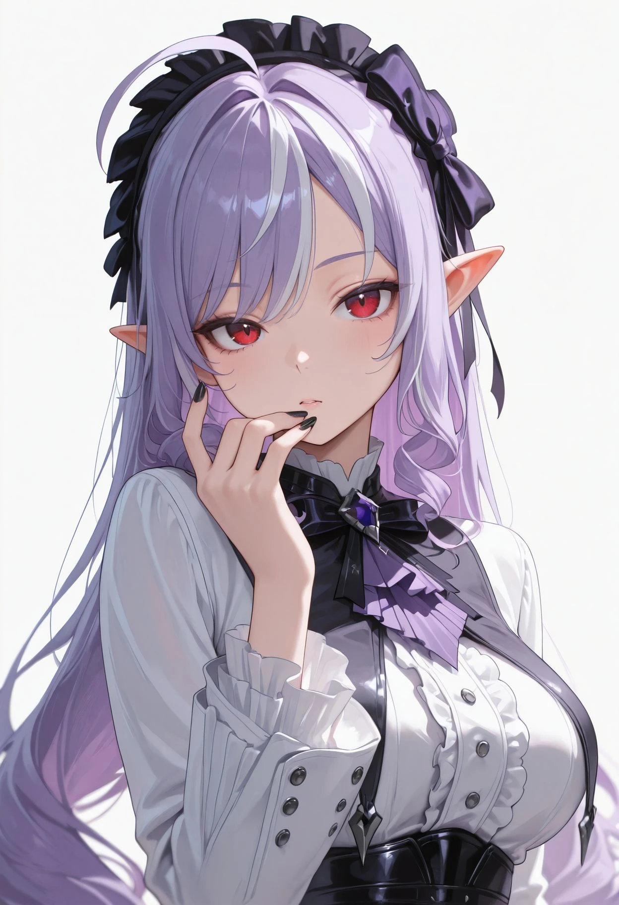 red eyes,ahoge,streaked hair,black hairband,frilled hairband, purple hair, hair bow