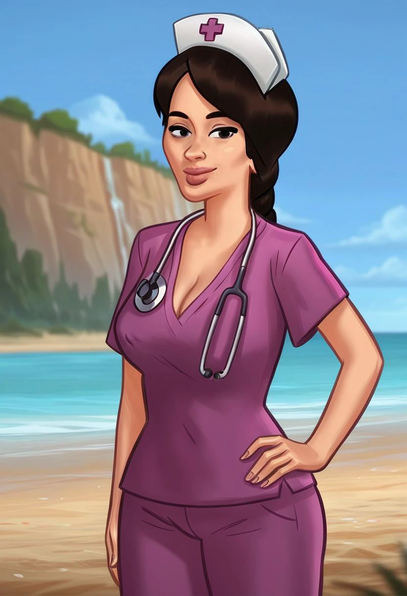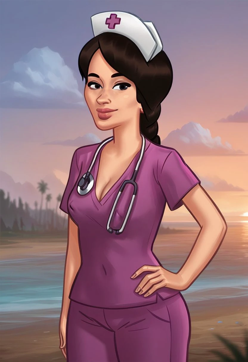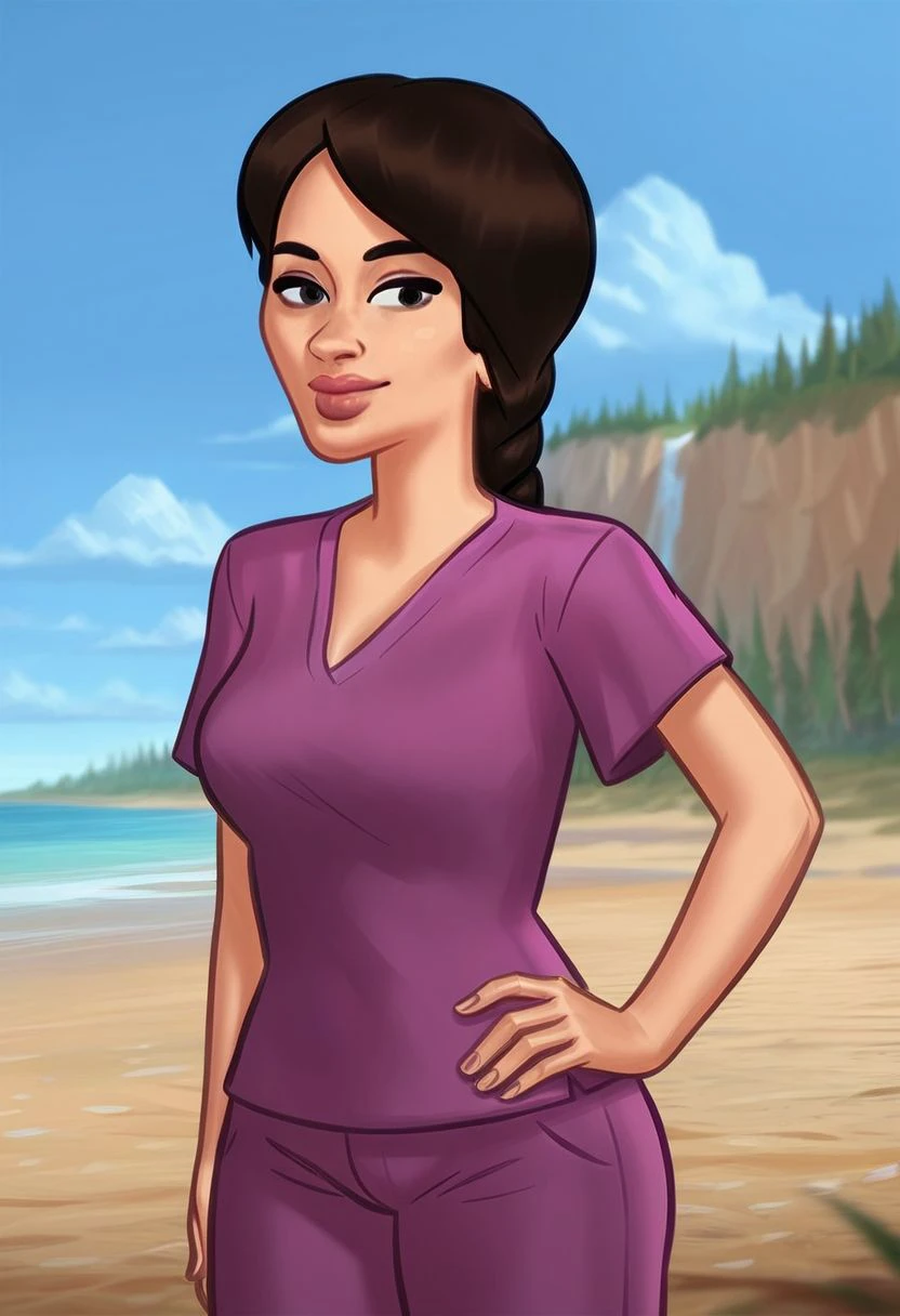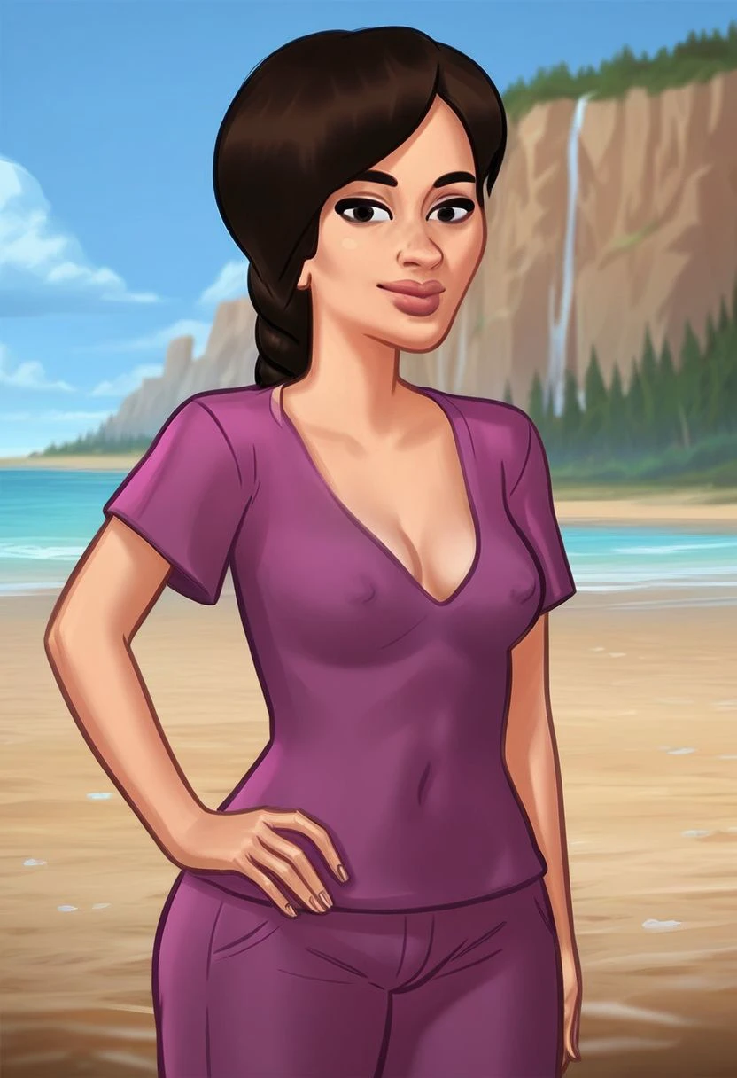 purple pants, purple shirt, short sleeves, cleavage, covered nipples