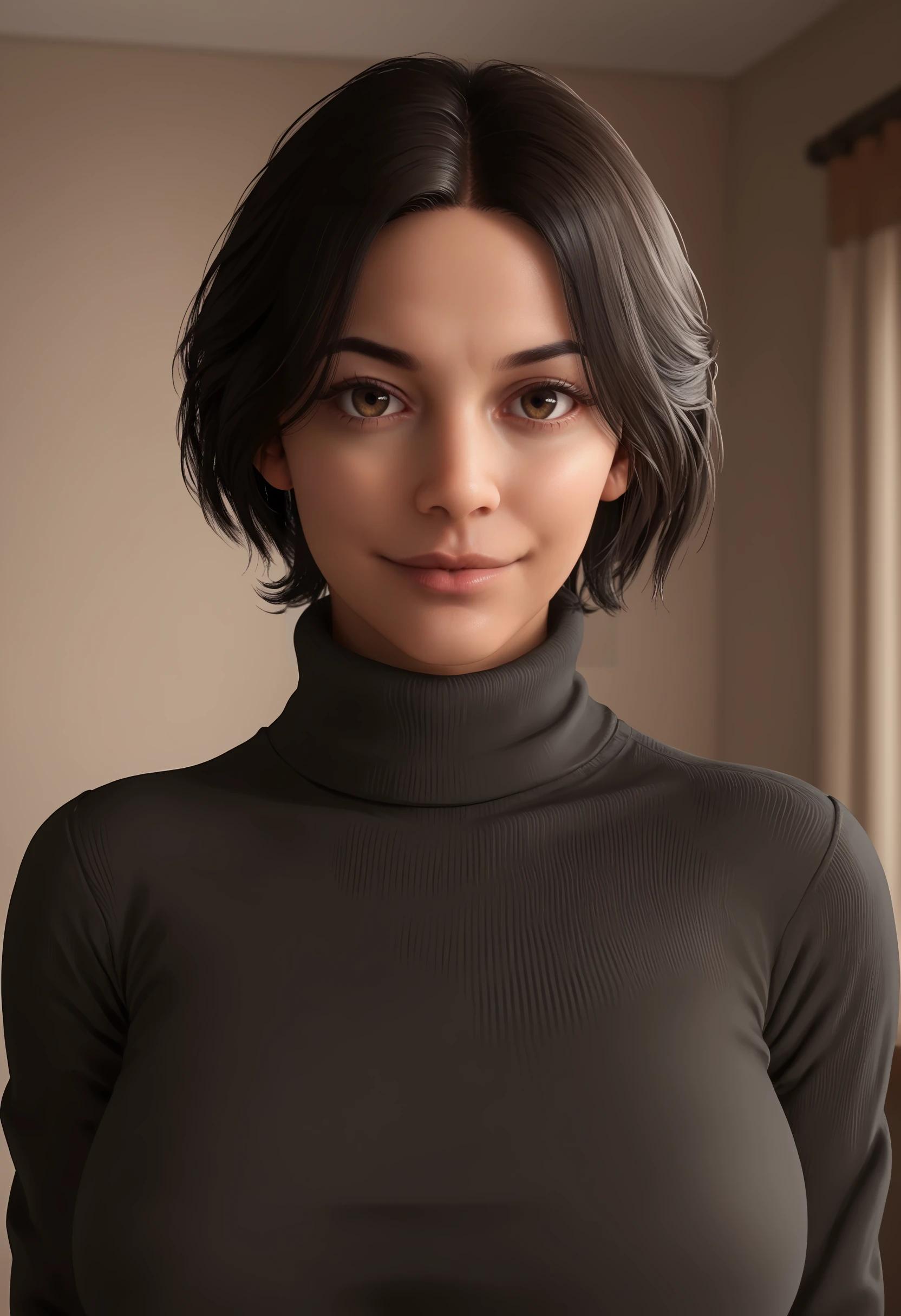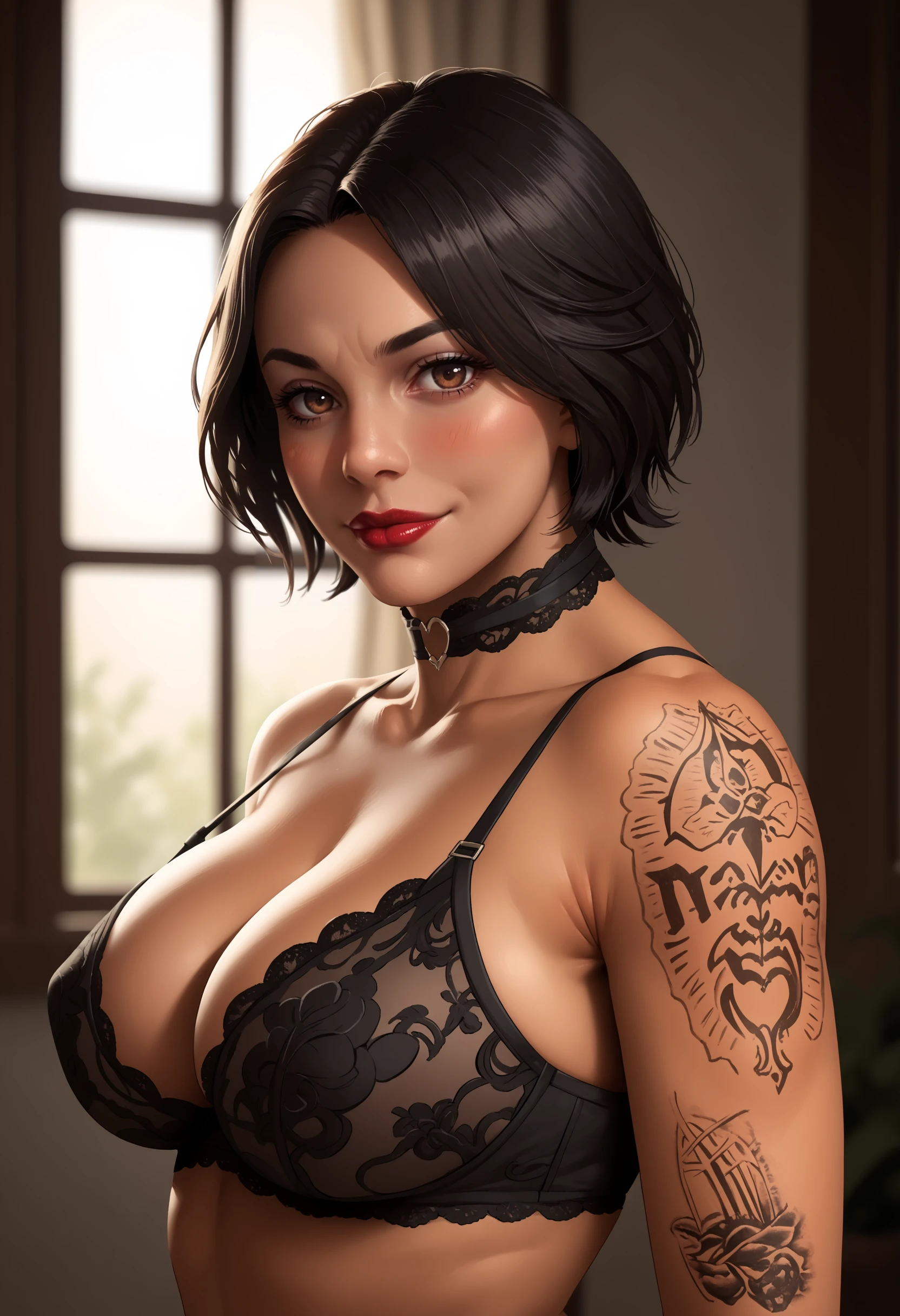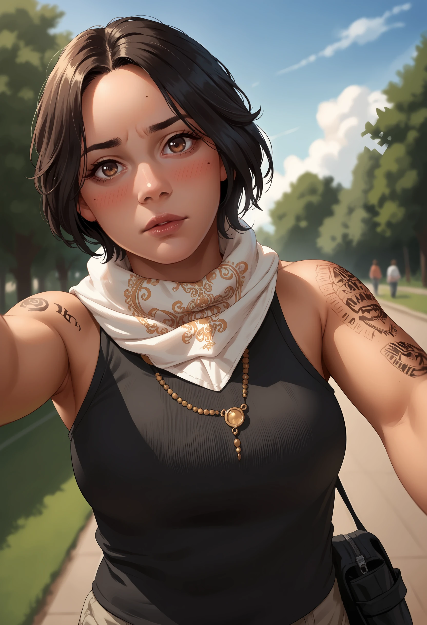 1girl, breasts, large breasts, short hair, black hair, lips, dark-skinned female, dark skin, brown eyes