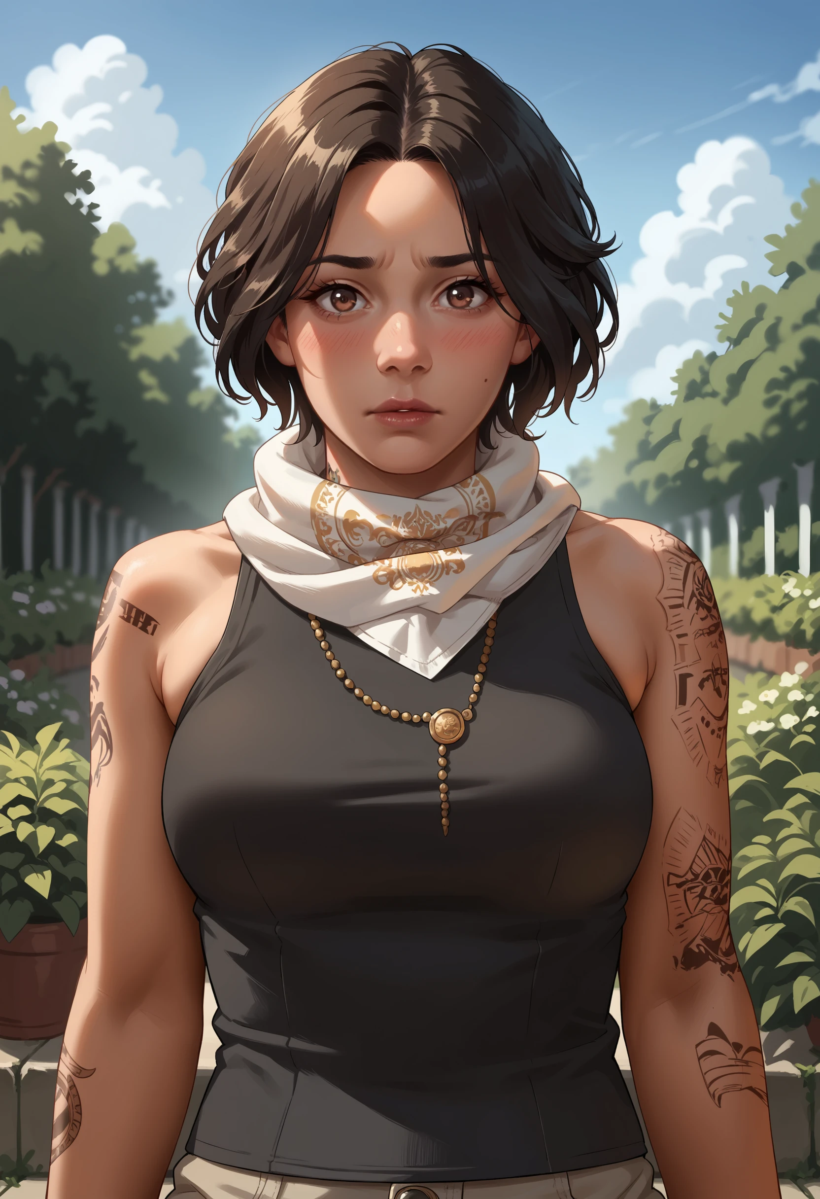 jewelry, necklace, pants, tank top, sleeveless, belt, scarf, tattoo, boots