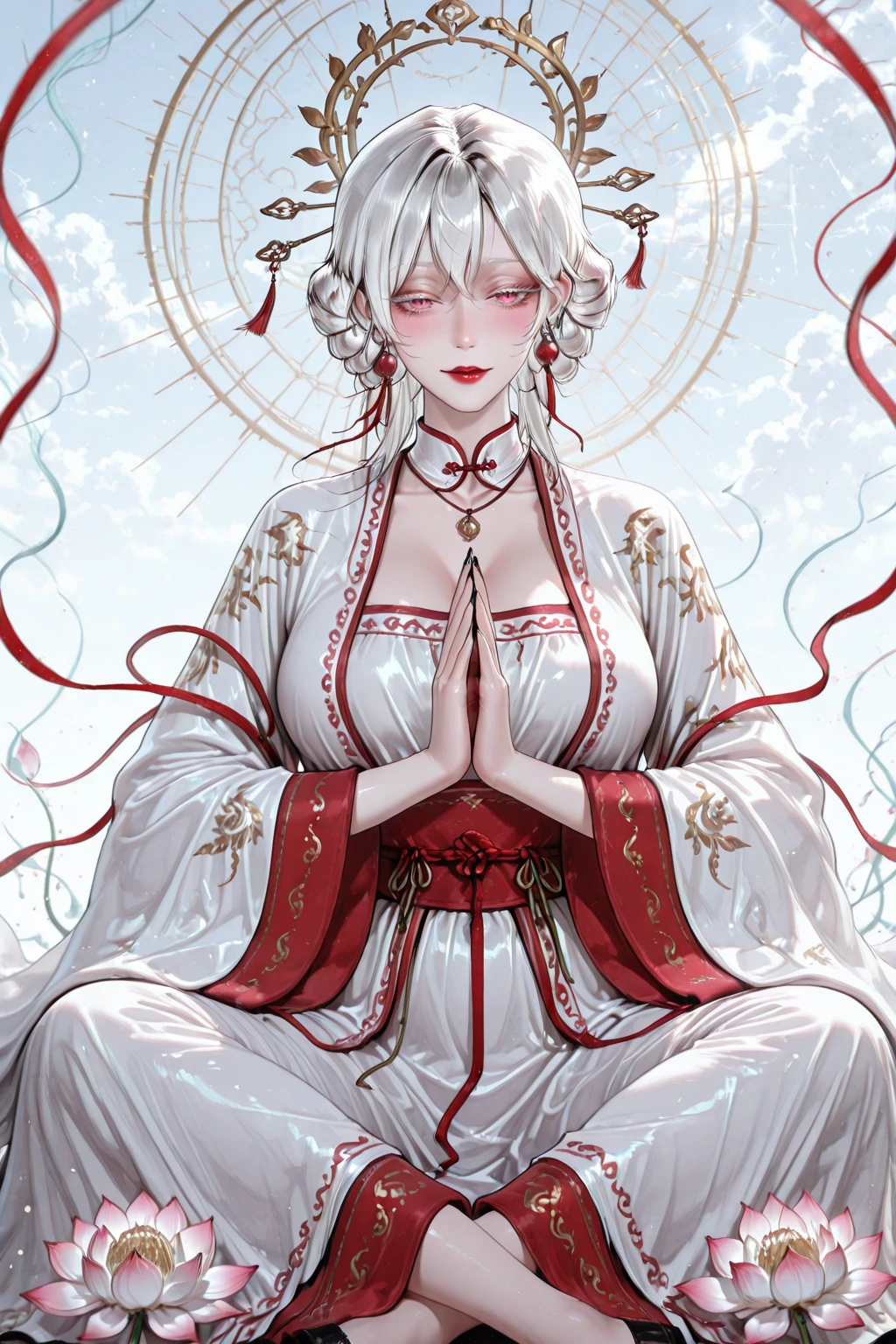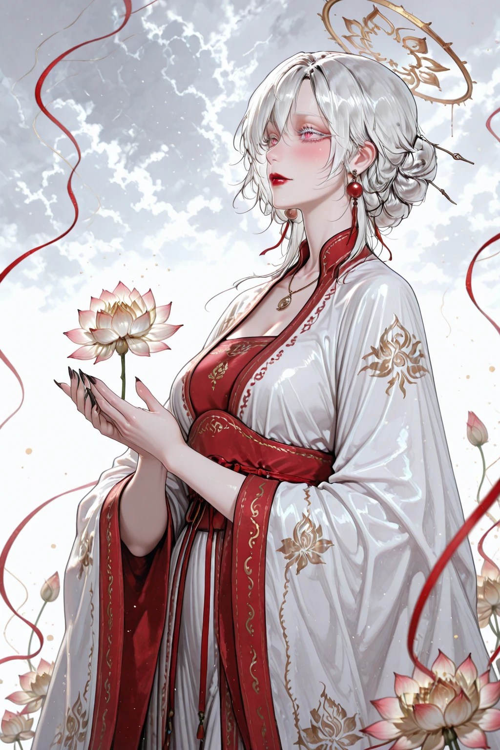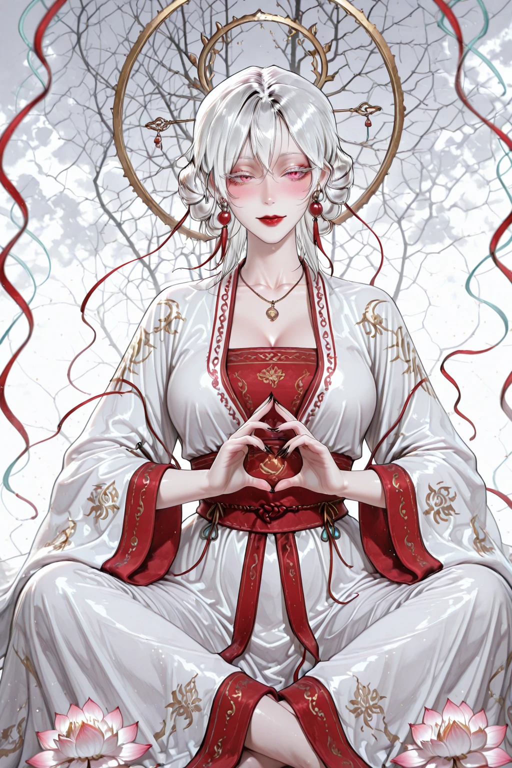 1girls, solo, wuxia, mature woman, bailingmiao, white hair, medium_hair, low buns, hair buns, hairpin, sharp eyes, hair_down, pink eyes, long eyelashes, white eyelashes, white eyebrows, red lipstick, blush, pale skin, bead earrings ,