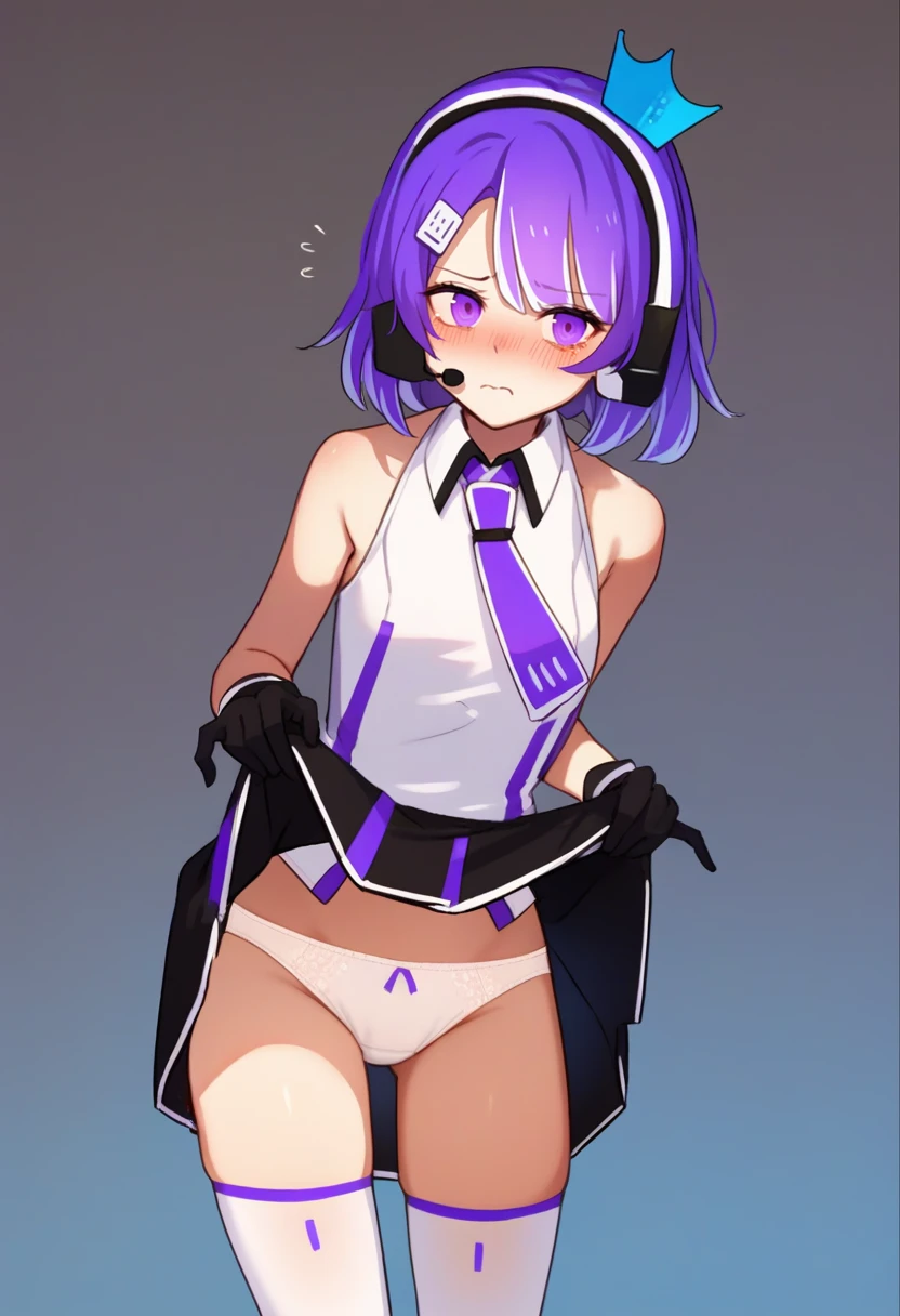 Default Outfit: headset, crown, white shirt, sleeveless shirt, purple necktie, black gloves, black skirt, white thighhighs, bare shoulders