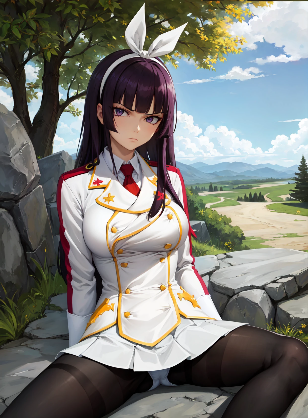 skirt, large breasts, gloves, jacket, jacket, pantyhose, pleated skirt, white gloves, miniskirt, blunt bangs, uniform, black pantyhose, military, military uniform, buttons, frown, white jacket, white skirt, serious, hime cut, double-breasted;
