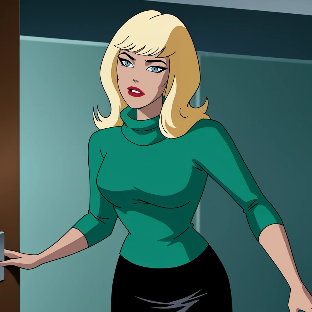 Trigger : SapphireDCAU, 1girl, blonde hair, black skirt, turtleneck, green sweater, blue eyes, lipstick, makeup, red lips, pencil skirt, long hair, medium breasts, green shirt, miniskirt