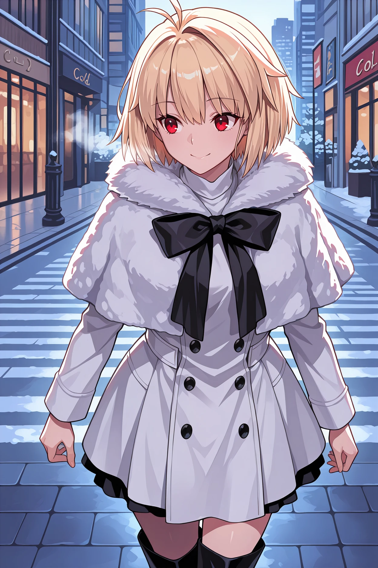 Add "wntracd, antenna hair, blonde hair, short hair, red eyes, single hair intake, white capelet, fur capelet, white coat, winter coat, long sleeves, black buttons, black bowtie, black thigh boots" for her winter coat.