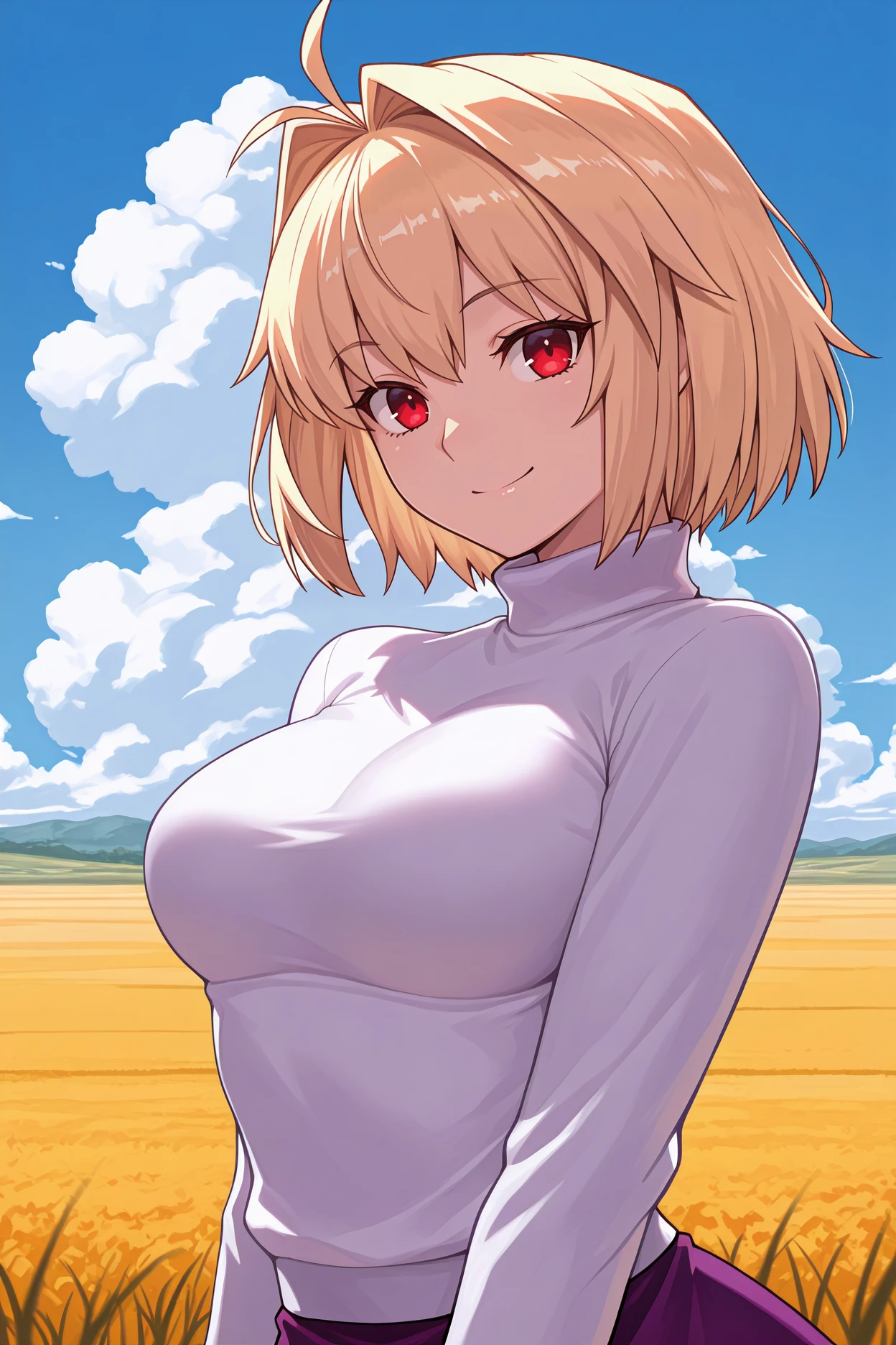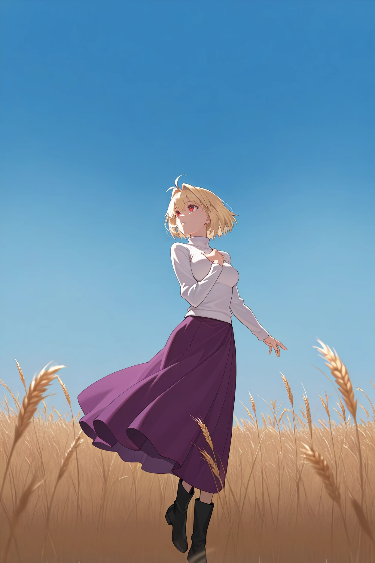 Add "ogacd, antenna hair, blonde hair, short hair, red eyes, hair intakes, turtleneck, white sweater, long skirt, purple skirt, black boots" for her original look with the long skirt.