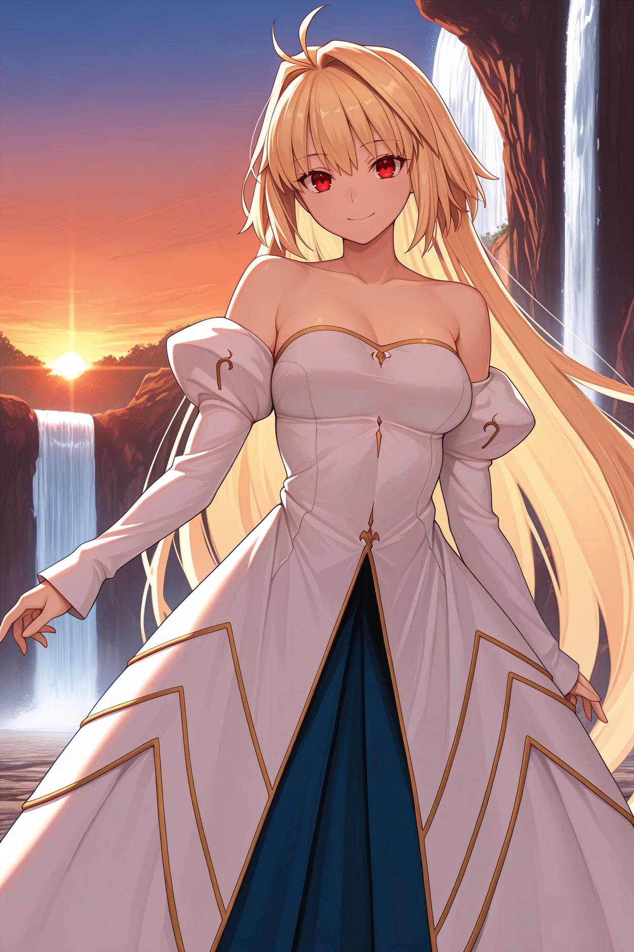 Add "atpacd, antenna hair, blonde hair, red eyes, very long hair, hair intakes, bare shoulders, juliet sleeves, detached sleeves, sleeves past wrists, strapless dress, white dress, blue skirt, layered dress, long skirt" for her Archetype Earth outfit.