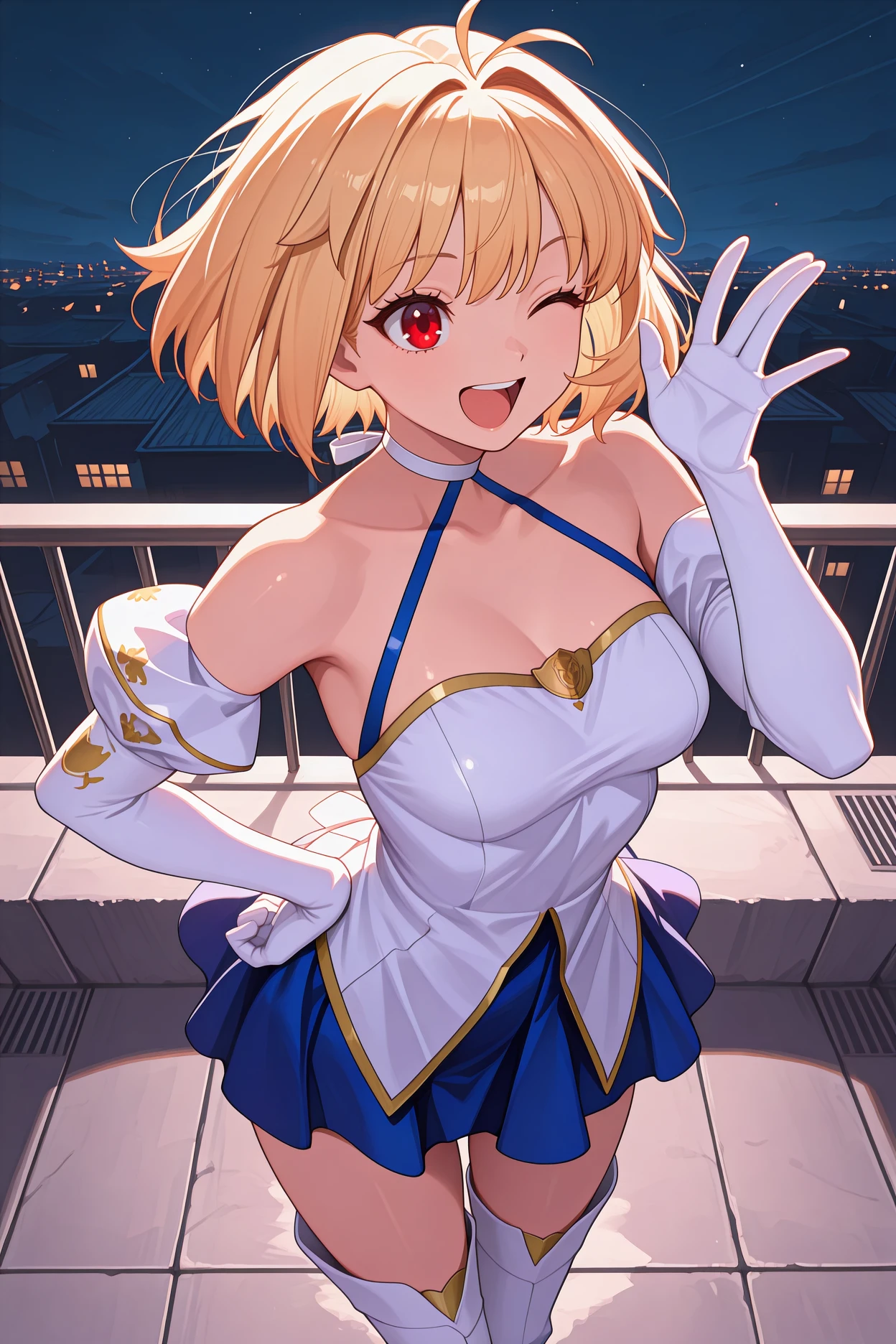 Add "1pmacd, antenna hair, blonde hair, short hair, red eyes, hair intakes, magical girl, white choker, white dress, short dress, elbow gloves, white gloves, detached sleeves, blue skirt, pleated skirt, white thigh boots" for Phantas-Moon (1st Ascension).