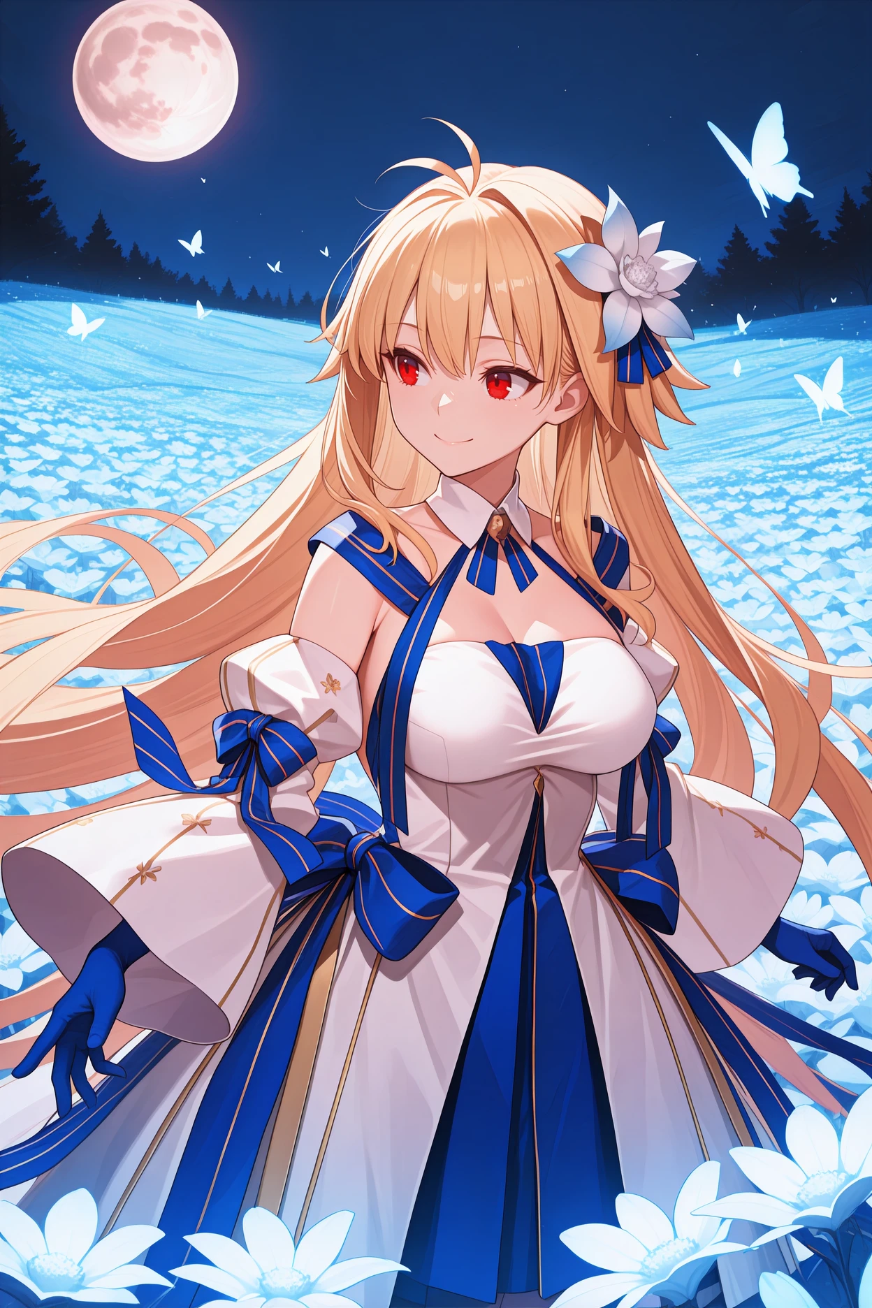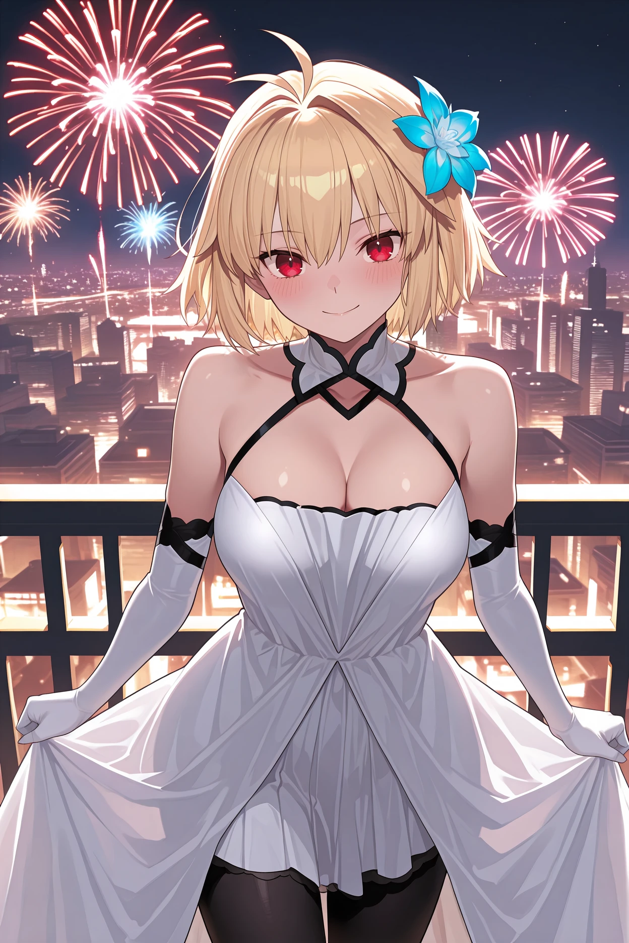 Add "glacacd, antenna hair, blonde hair, short hair, red eyes, hair intakes, hair flower, blue flower, white collar, white dress, cocktail dress, cleavage, black straps, white gloves, elbow gloves, black pantyhose, black high heels" for her Clad in Glacier outfit.
