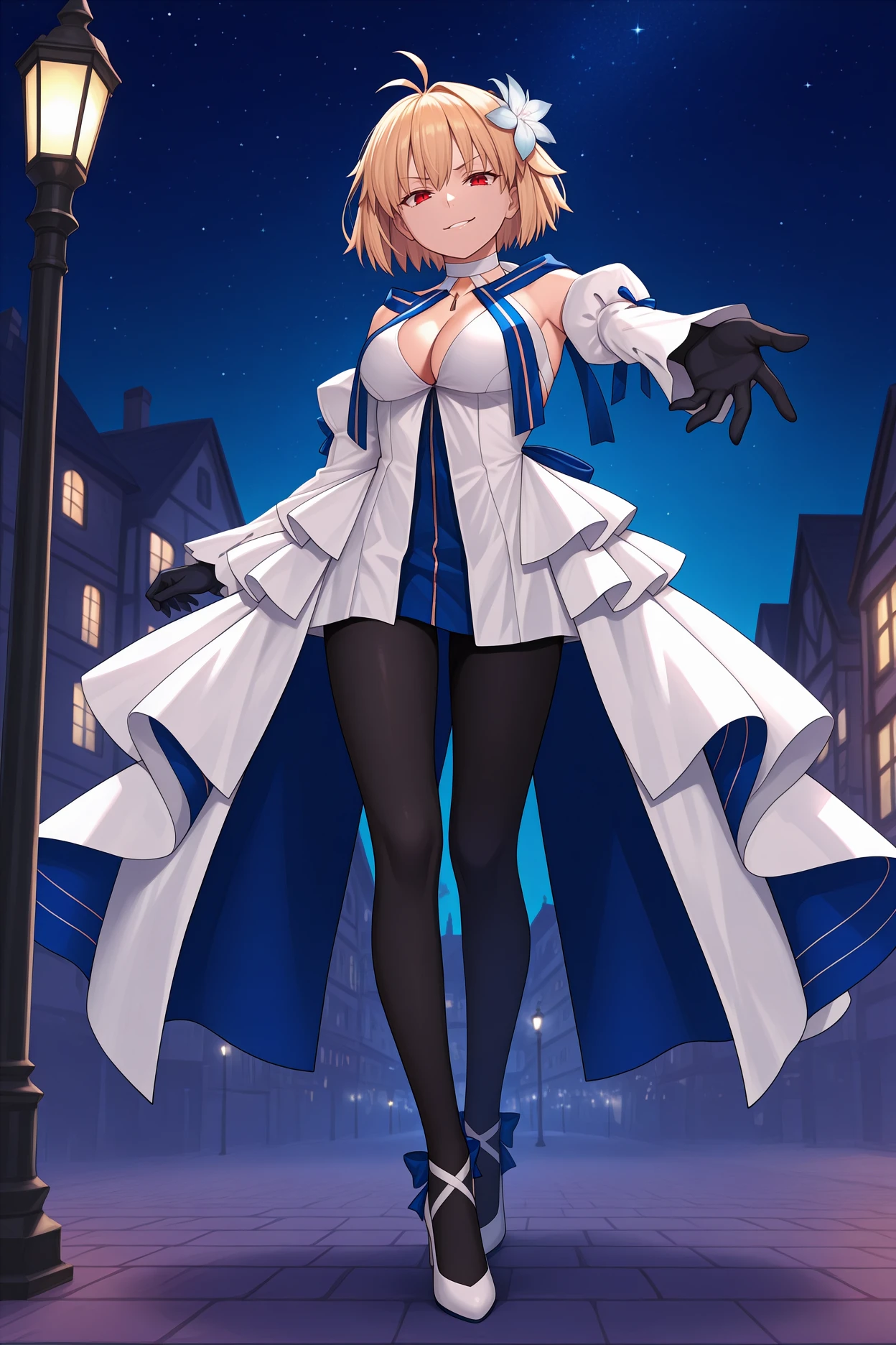 Add "2atpacd, antenna hair, blonde hair, short hair, red eyes, hair flower, blue ribbons, white choker, halterneck, white gown, cleavage, detached sleeves, white sleeves, black gloves, white overskirt, black pantyhose, white high heels" for Archetype Earth (2nd Ascension).