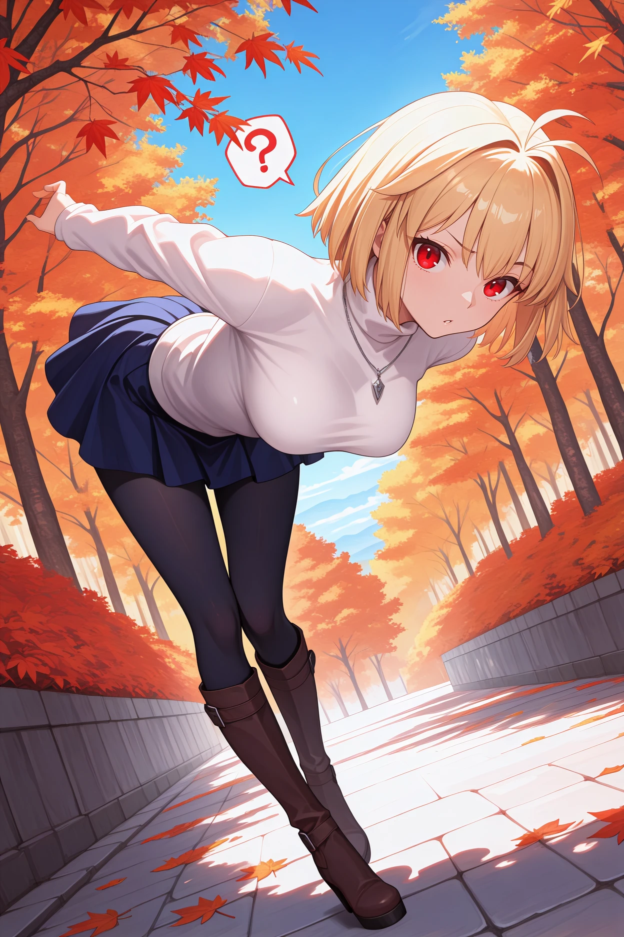 Add "defacd, antenna hair, blonde hair, short hair, red eyes, hair intakes, necklace, white sweater, turtleneck, dark blue skirt, miniskirt, pleated skirt, black pantyhose, brown boots, knee boots, belt boots" for her remake look with the miniskirt.