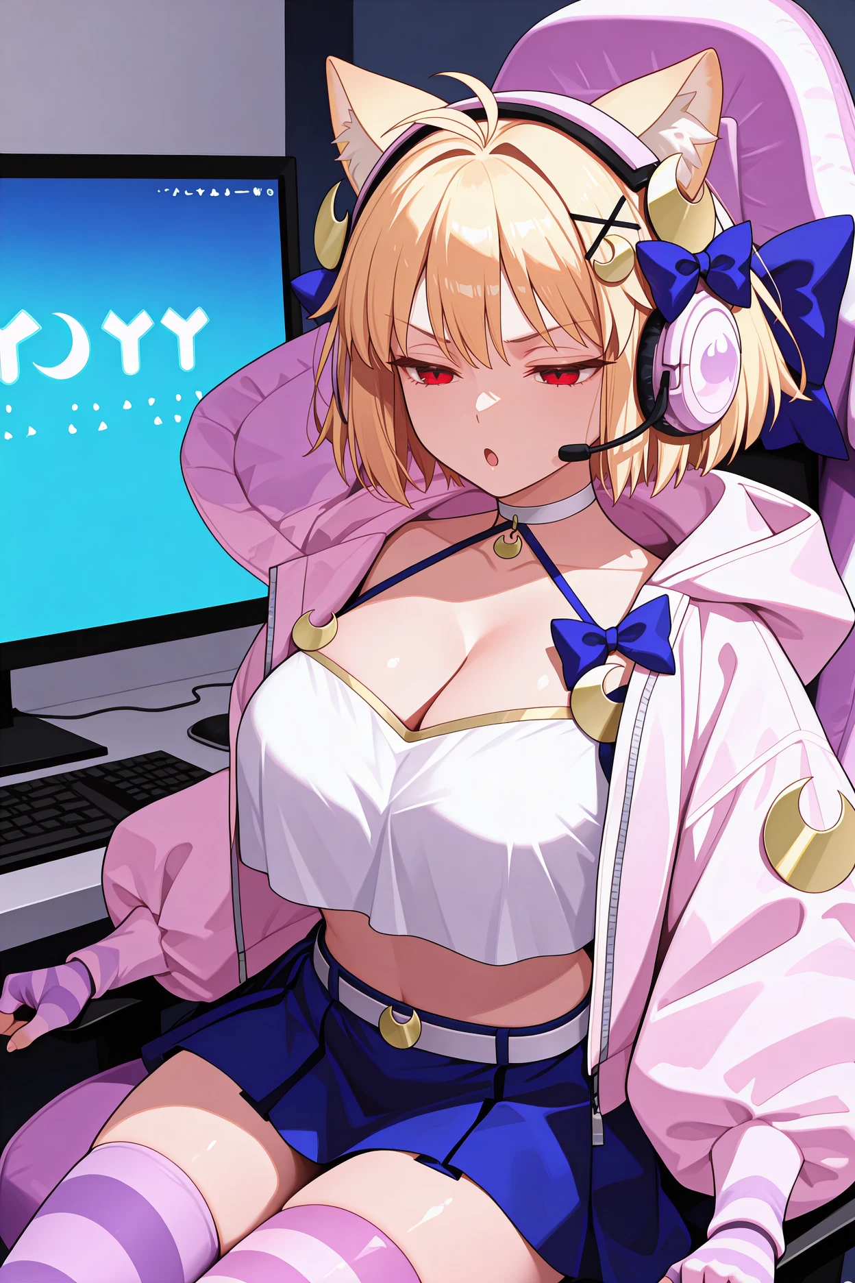 Add "2pmacd, antenna hair, blonde hair, short hair, red eyes, cat ears, crescent hair ornament, hair bow, blue bow, headset, headphones, white choker, hooded jacket, hood up, pink jacket, open jacket, puffy long sleeves, cleavage, white camisole, midriff, crop top overhang, striped gloves, fingerless gloves, pink gloves, white belt, blue skirt, pleated skirt, miniskirt, single thighhigh, striped thighhigh, pink thighhigh, purple thighhigh, toeless legwear" for Phantas-Moon (2nd Ascension).