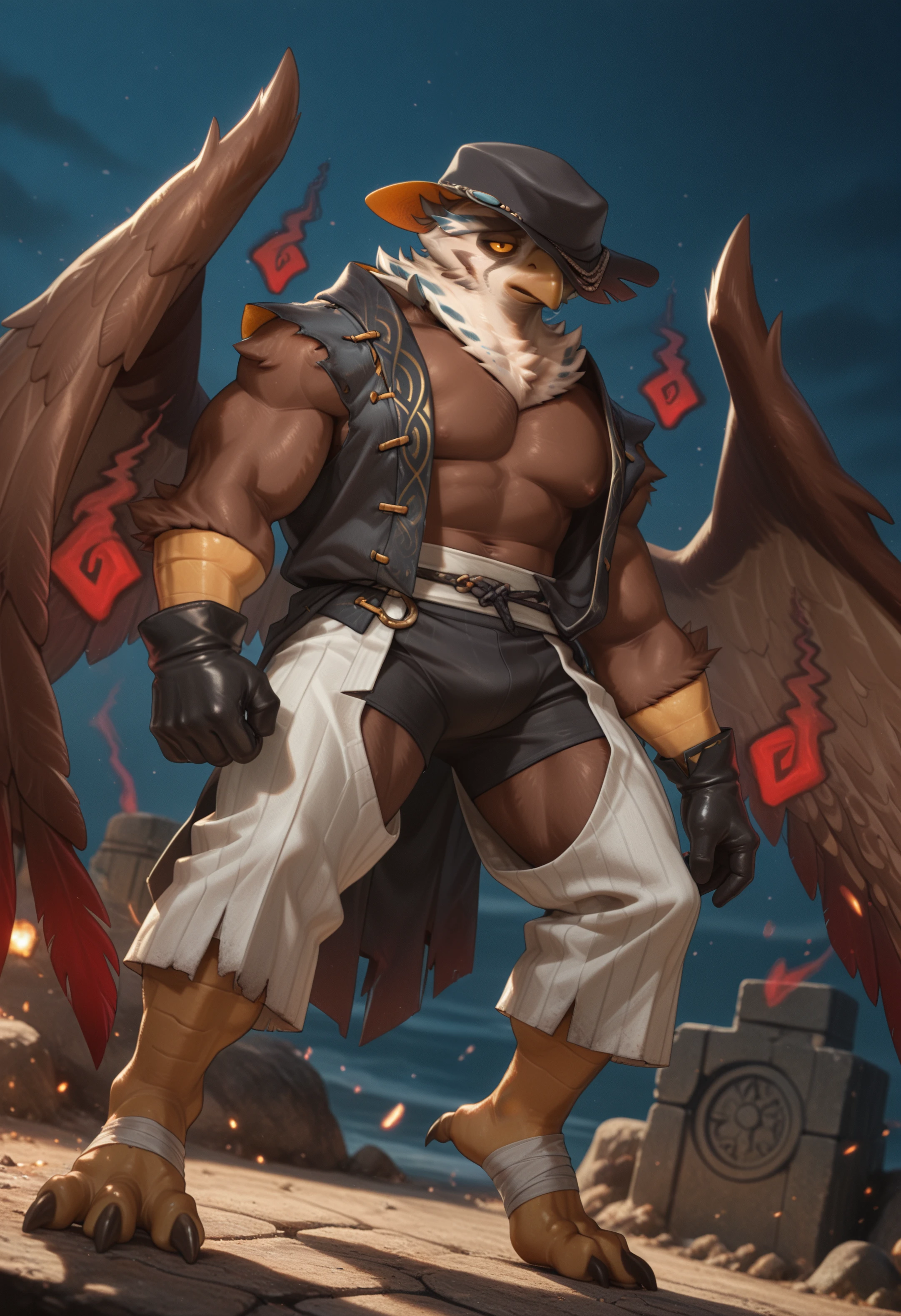 wat4nab3_h1t0ha_xxl_w0ofia, anthro, male focus, furry male, male, bara, furry, muscular male, avian, accipitrid, hi res, solo, 1boy, , (floating symbols, symbols:1.2), feathered wings, beak, short hair, blue highlights, yellow sclera, feathers, body fur, fur, bird boy, brown feathers, brown wings, bird tail, feathered tail, talons