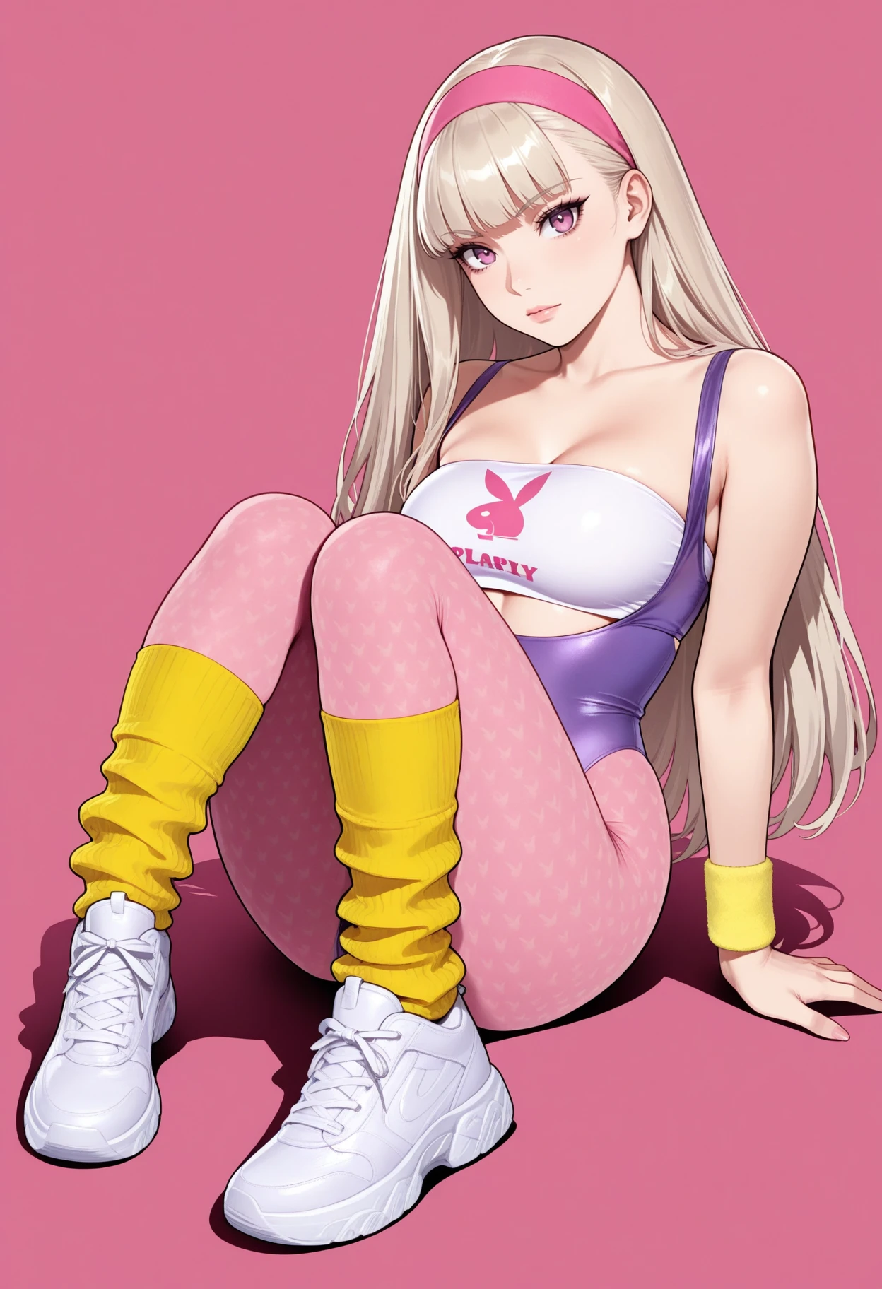 Sweatband, hairband, white bandeau, (purple leotard) (pink patterned pantyhose), clothes writing, leg warmers, sneakers