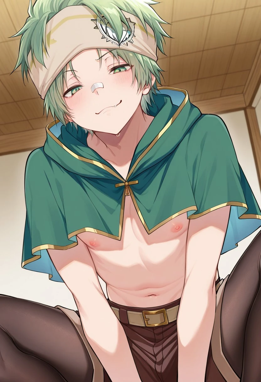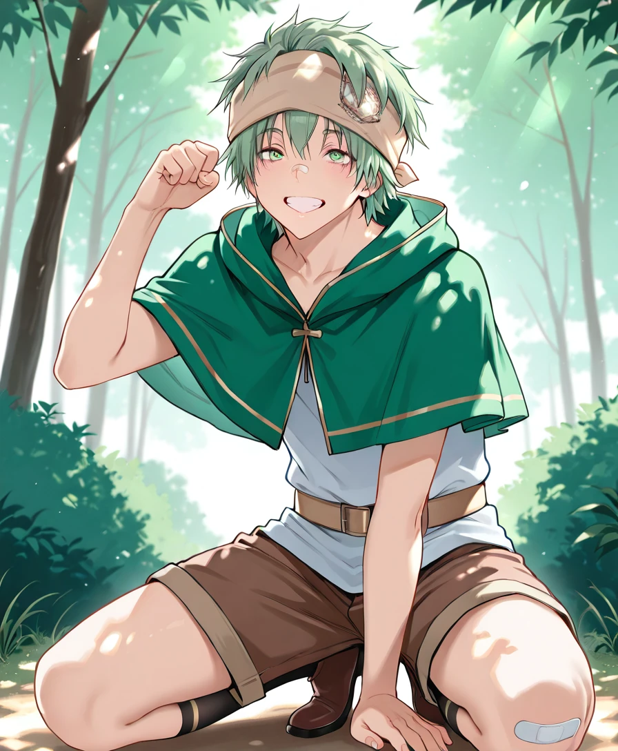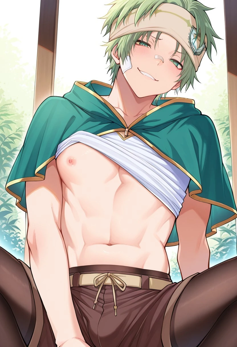 gashita,green hair,green eyes,headband,bandaid on face,