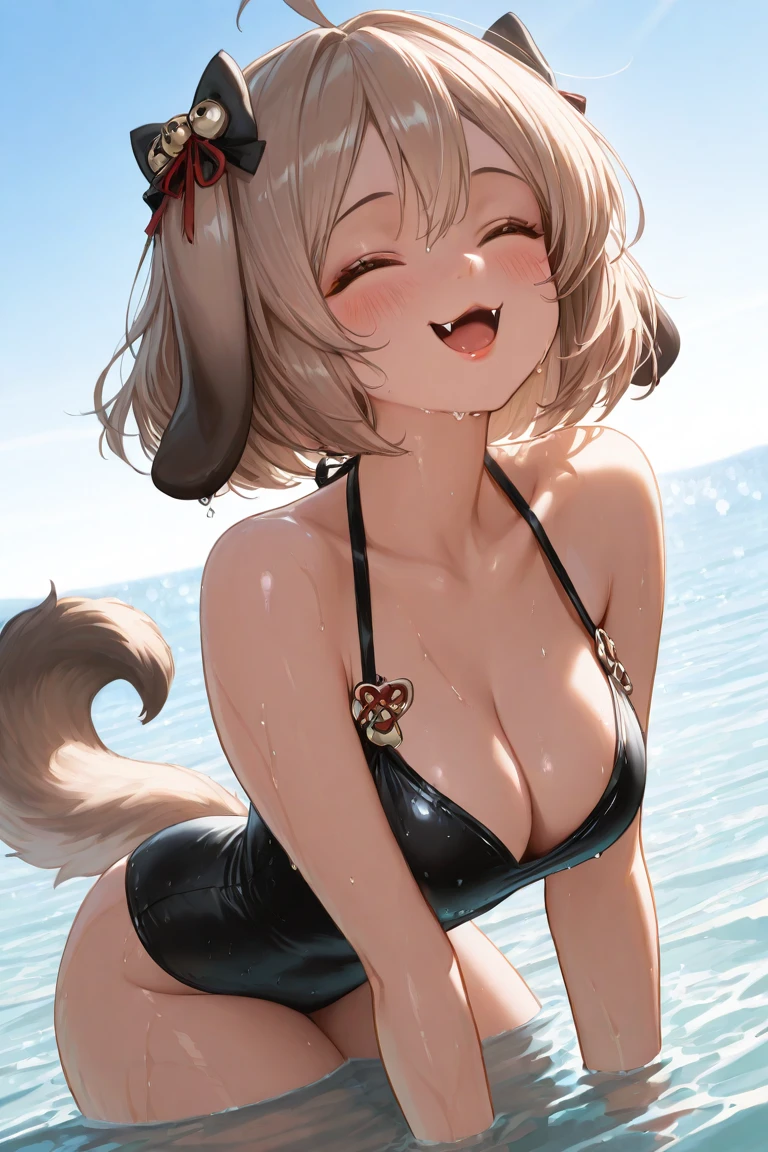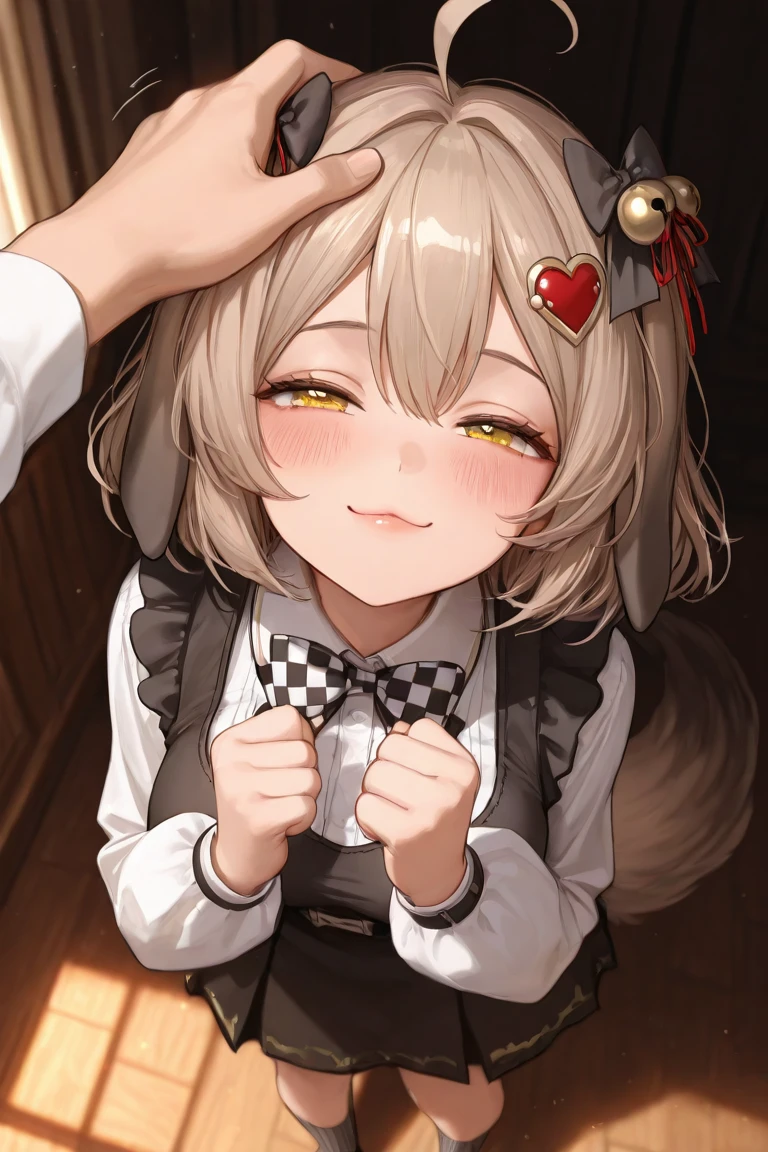 Biscuit_Base,yellow eyes,short hair,brown hair,light brown hair,ahoge,fang,animal ears,dog ears,dog tail,dog girl,hair ribbon,heart hair ornament,bone hair ornament,hair bell,bowtie,checkered bow,white shirt,long sleeves,puffy sleeves,black dress,pinafore dress,short dress,pleated dress,belt,grey socks,ribbed socks,loafers,black footwear,shoulder bag,Spring Puppy: