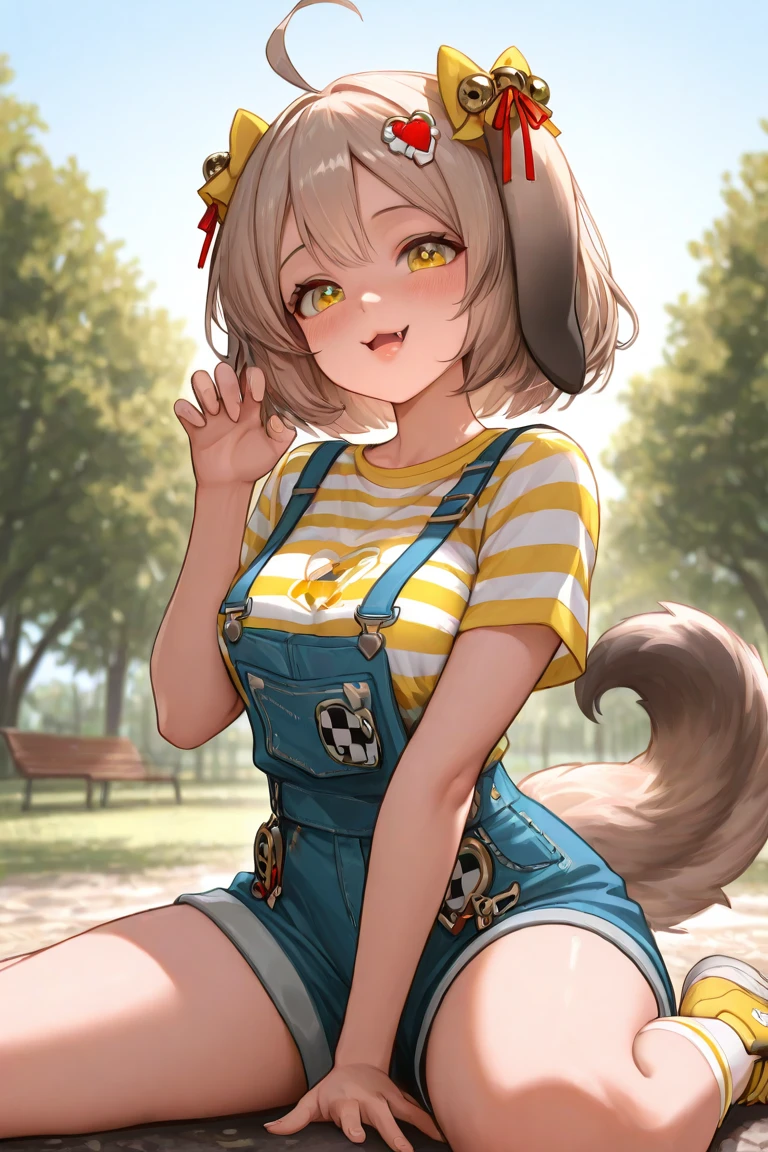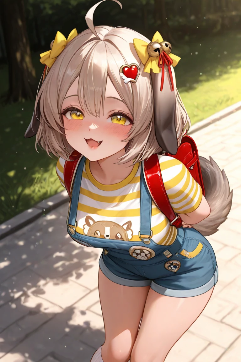 Biscuit_Spring,yellow eyes,short hair,brown hair,light Brown hair,ahoge,fang,animal ears,dog ears,dog tail,dog girl,hair ribbon,heart hair ornament,bone hair ornament,hair bell,shirt,short sleeves,striped shirt,t-shirt,yellow shirt,print shirt,blue overalls,overall shorts,kneehighs,white socks,asymmetrical legwear,shoes,sneakers,yellow footwear,backpack,randoseru,red bag,oficial alternate costume,Description