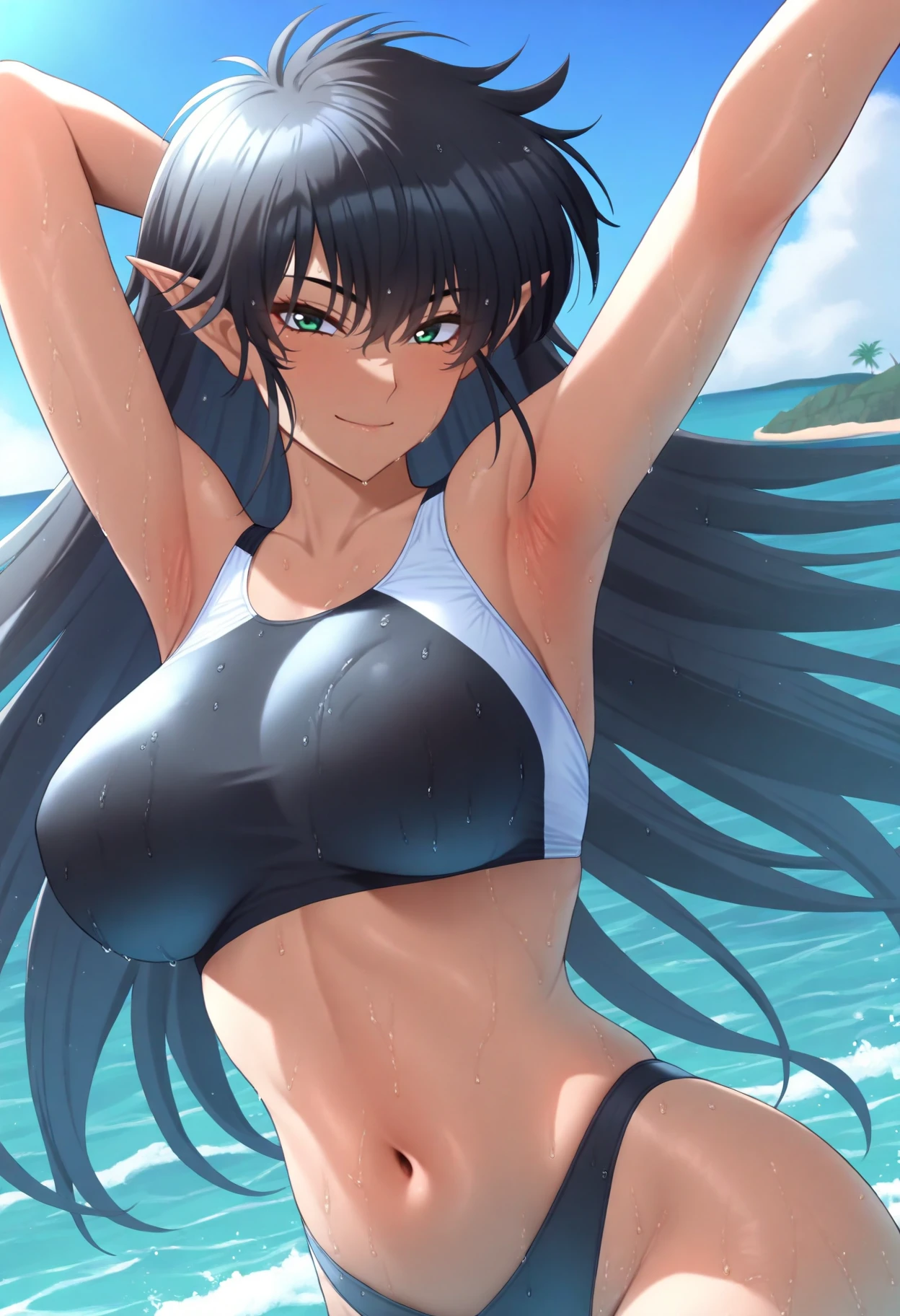 Basic prompts : arshesnei, 1girl, black hair, long hair, green eyes, pointy ears, dark skinOutfit/Armor related prompts : armor, black fingerless gloves, breastplate, shoulder armor, pevial curtain, thighhighs, boots, belt, pauldrons, spikes, leotard, thighhighs, bridal gauntlets, elbow gloves, bare shoulders, sleeveless, bare shoulders, greaves, highleg leotard, knee pads