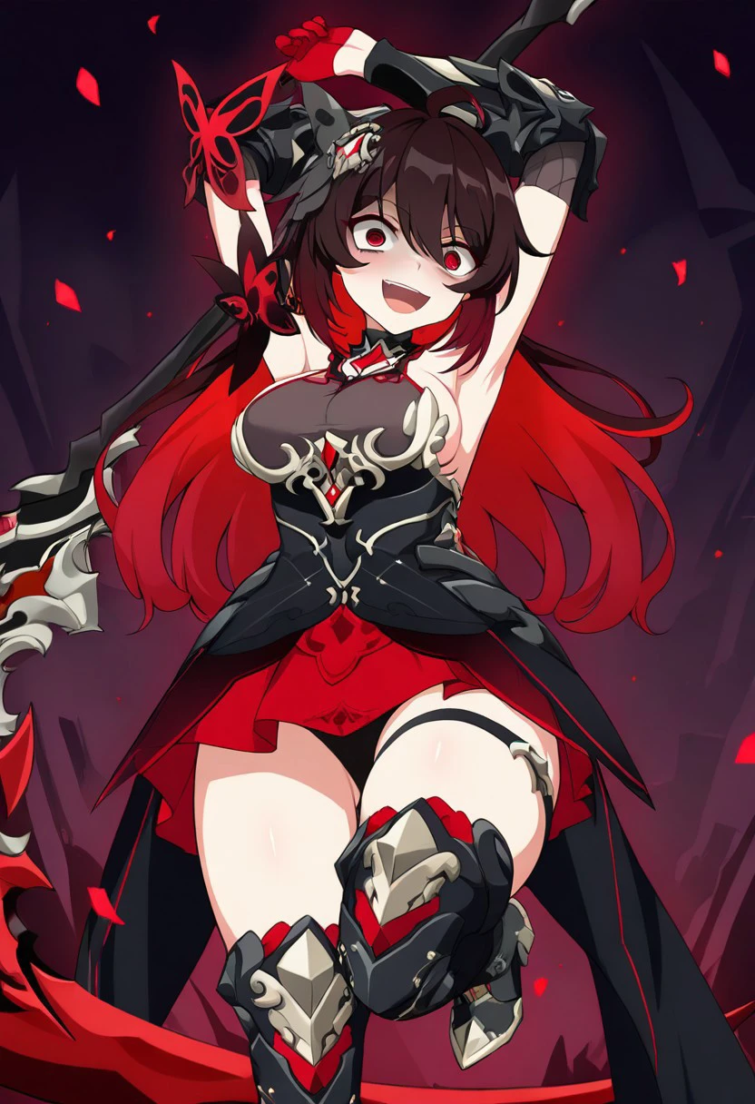1girl, solo, SeeleVelionaNyx, red eyes, black and red hair, two-tone hair, multicolored hair, colored inner hair, long hair, hair between eyes, ahoge, hair ornament, sleeveless shirt, bare shoulders, collar, necklace, red gems, gold underbust, gray top, sideboobs, black corset, red skirt, miniskirt, gunmetal and gold thigh boots, red gloves, thighstrap, gauntlets, butterfly decorations, coattails, bare shoulders