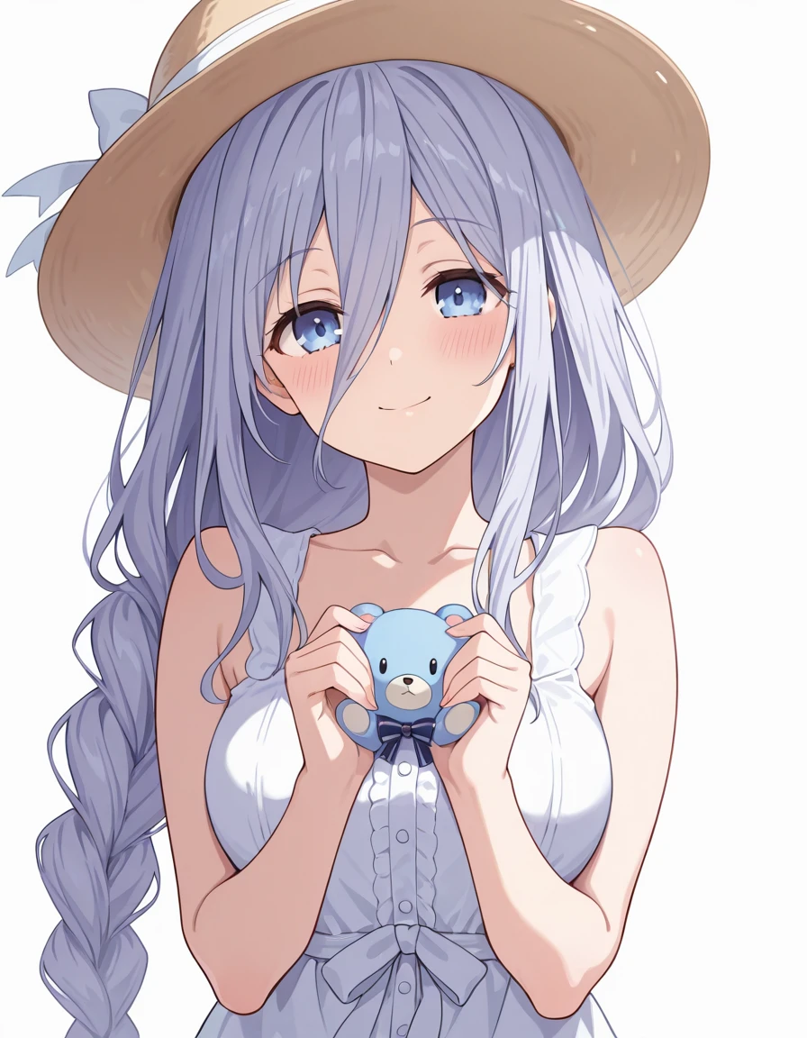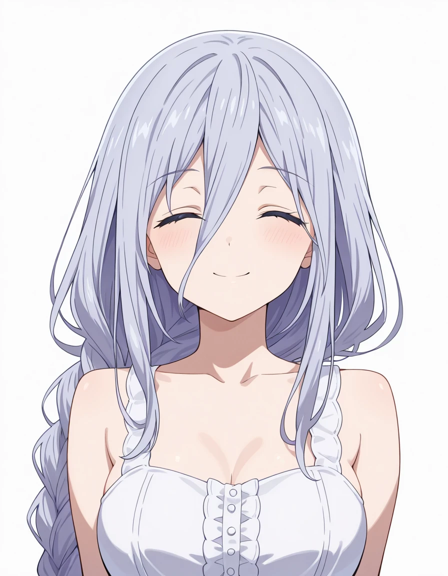 Takamiya Mio, grey hair, blue eyes, hair between eyes, single braid, very long braidlow tied: