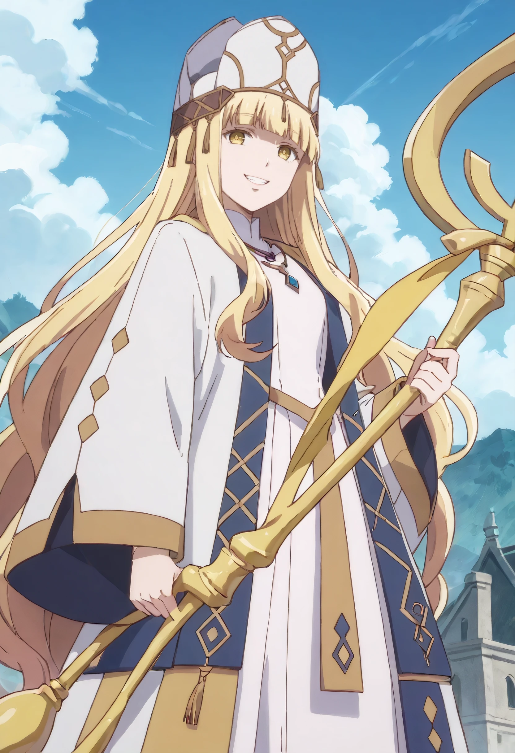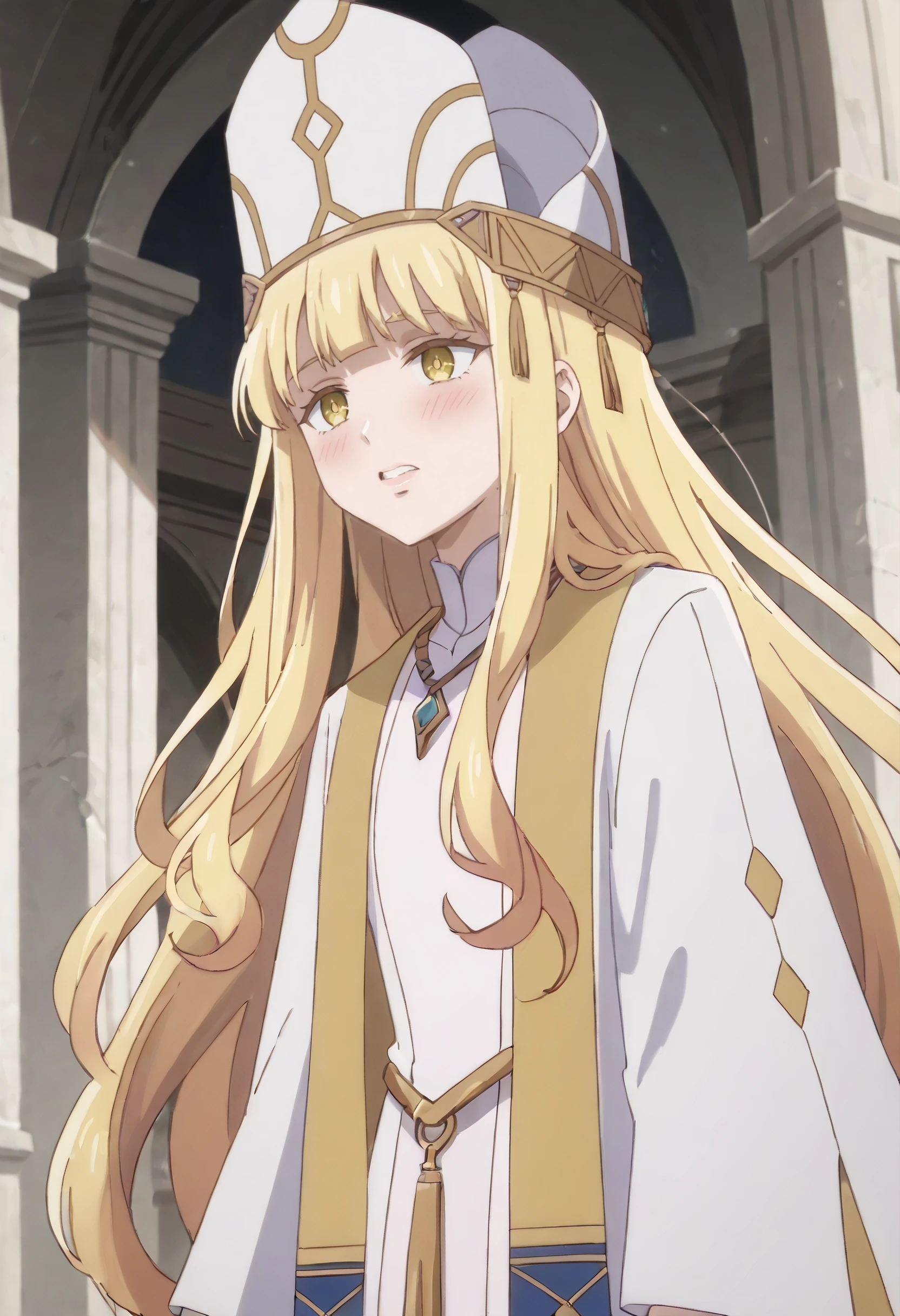 SoalinaOutfit, hat, dress, white hat, white robe, robe, mitre, white dress, long sleeves, jewelry, necklace, white headwear, wide sleeves, dalachi (headdress), cape, hair ornament, priest,
