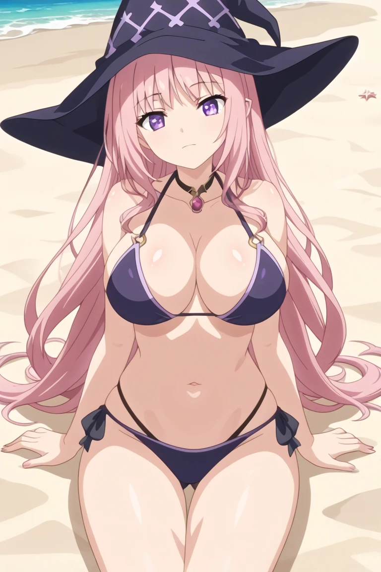 lifulia,1girl,pink hair,long hair,purple eyes,large breasts,open cloak, open clothes, witch hat, bike shorts,