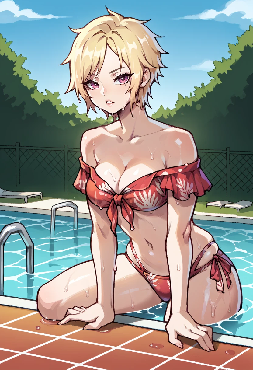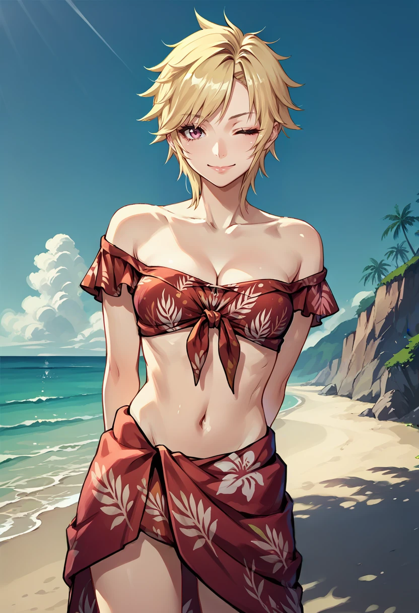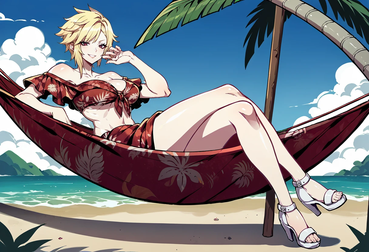 swimMilady, short hair, off-shoulder bikini, print bikini, front-tie top, sarong, white sandals, high heels