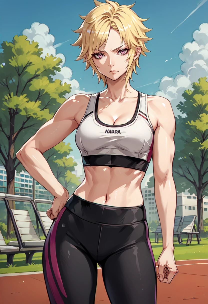 Default appearance: defMilady, short hair, ear piercing, earrings, frilled choker, red jacket, cleavage, long sleeves, frilled sleeves, half gloves, orange gloves, white belt, belt pouch, black miniskirt, short shorts, pantyhose, thigh pouch, high heel boots