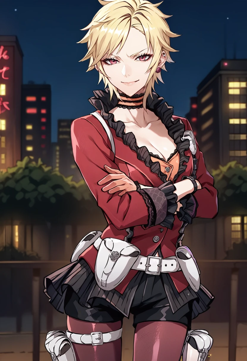 defMilady, short hair, ear piercing, earrings, frilled choker, red jacket, cleavage, long sleeves, frilled sleeves, half gloves, orange gloves, white belt, belt pouch, black miniskirt, short shorts, pantyhose, thigh pouch, high heel boots